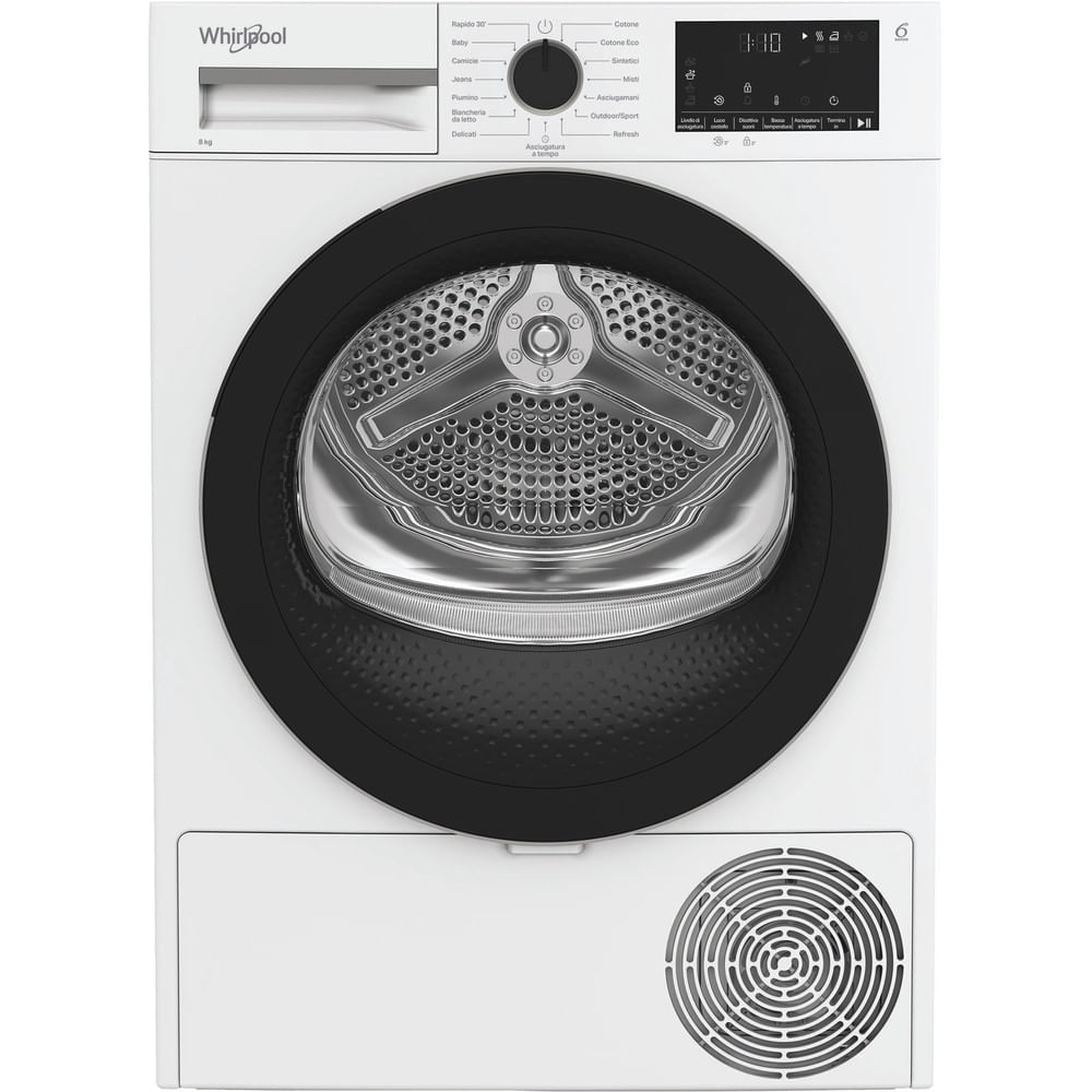 Whirlpool C WD 83M WBS IT, Capacità 8kg, classe D, colore White, Display digitale XL. Posizionamento dell'apparecchio: Libera installazione, Tipo di carica: Caricamento frontale, Sistema di asciugatura: Pompa di calore. Capacità cestello: 8 kg, Classe di efficienza della condensazione: B, Programmi di asciugatura: Auto, Cotton eco, Delicati/Seta, Jeans/denim, Mix, Refresh, Sport, Lana. Partenza ritardata: 24 h. Classe efficienza energetica: D, Consumo energetico per 100 cicli: 119 kWh, Consumo energetico: 1,19 kWh. Tecnologie Whirlpool (cura dei vestiti): 6TH SENSE