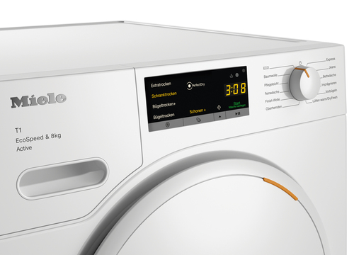 Miele TWA520WP. Posizionamento dell'apparecchio: Libera installazione, Tipo di carica: Caricamento frontale, Sistema di asciugatura: Pompa di calore. Capacità cestello: 8 kg, Classe di efficienza della condensazione: A, Programmi di asciugatura: Biancheria da letto, Delicati/Seta, Easy care, Express Wash&Dry, Jeans/denim, Shirts,.... Partenza ritardata: 24 h, Avvio ritardato (min): 1 h. Classe efficienza energetica: C, Consumo energetico per 100 cicli: 95 kWh, Fonte di calore: Elettrico. Tecnologie Miele (cura dei vestiti): EcoDry Technology, EcoSpeed, FragranceDos², Honeycomb drum