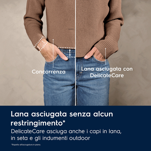 DelicateCare utilizza la tecnologia della pompa di calore per asciugare capi delicati con temperature e movimenti del cesto su misura aiutando i vestiti a durare più a lungo. Anche tessuti come la seta e la lana vengono asciugati con cura. Certificato Woolmark.