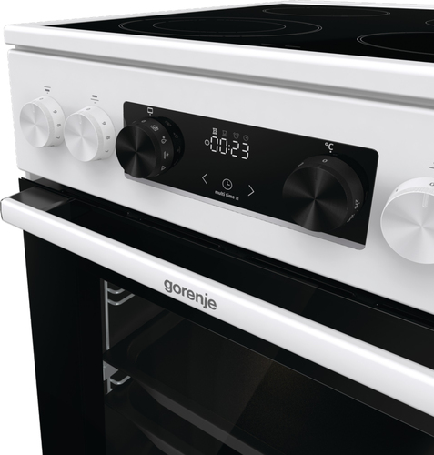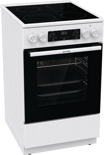Gorenje GECS5C70WA. Tipo di prodotto: Cucina, Colore del prodotto: Bianco, Tipo di controllo: Pulsanti, Manopola. Tipo di piano cottura: Piano cottura a bobina, Numero totale di fuochi: 4 Fornello(i), Numero di piastre elettriche: 4 Fornello(i). Dimensione del forno: Media, Sorgente di alimentazione del forno: Elettrico, Capacità netta del forno: 70 L. Consumo energetico (convenzionale): 0,98 kWh, Consumo energetico (convezione forzata): 0,8 kWh, Tensione di ingresso AC: 220 - 240 V. Larghezza: 500 mm, Profondità: 594 mm, Altezza: 850 mm