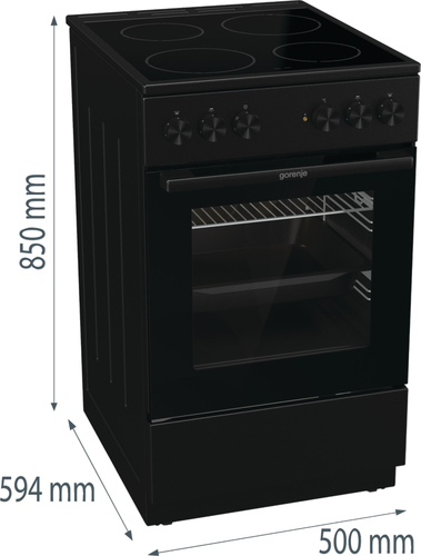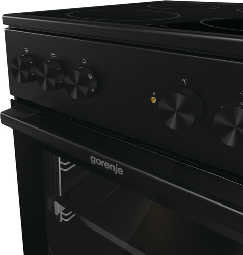 Gorenje GEC5A20BG. Tipo di prodotto: Cucina, Colore del prodotto: Nero, Tipo di controllo: Manopola. Tipo di piano cottura: Ceramica, Numero totale di fuochi: 4 Fornello(i), Tipo di superficie superiore: Vetro-ceramica. Dimensione del forno: Media, Sorgente di alimentazione del forno: Elettrico, Capacità netta del forno: 74 L. Indicatori LED: Potenza. Consumo energetico (convenzionale): 0,82 kWh, Potenza aggregata (elettrica): 8600 W, Tensione di ingresso AC: 230 - 400 V