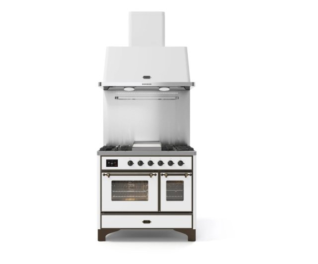 Blocco cottura a libera installazione della linea di elettrodomestici Majestic da 100 cm, con doppio forno e configurabile in 5 versioni: 6 fuochi, 6 fuochi con fry-top, 4 fuochi e 2 zone ad induzione, 4 fuochi con coupe de feu, 6 zone ad induzione. Disponibile in 9 colori e 4 finiture e personalizzabile con i colori RAL. Il blocco cottura presenta bruciatori a gas Dual con potenza fino a 5 kW e integra un forno elettrico multifunzione da 60 cm con un range di temperatura da 30 a 320°, e un forno elettrico multifunzione da 30 cm con un range di temperatura da 30 a 250°. Il blocco cottura presenta display TFT 4,3″ full touch.