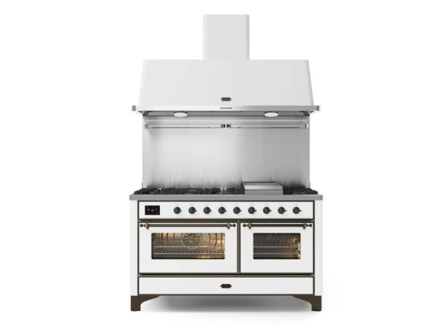 Blocco cottura a libera installazione della linea di elettrodomestici Majestic da 150 cm, con doppio forno e configurabile in 3 versioni: 9 fuochi con fry-top, 7 fuochi con fry-top e coupe de feu, 7 fuochi con coupe de feu. Disponibile in 9 colori e 4 finiture e personalizzabile con i colori RAL.