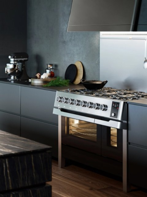 Blocco cottura a libera installazione della linea di elettrodomestici professionali ad uso domestico Panoramagic da 120 cm con doppio forno e configurabile in 3 versioni: 8 fuochi, 8 fuochi con fry-top, 7 zone ad induzione. Disponibile in acciaio inox e finiture satinate. Il blocco cottura presenta bruciatori a gas Dual con potenza fino a 5 kW e integra un forno elettrico multifunzione da 80 cm con un range di temperatura da 30 a 320°C e un forno elettrico multifunzione da 30 cm con un range di temperatura da 30 a 250°. Il blocco cottura presenta display TFT 4,3″ full touch