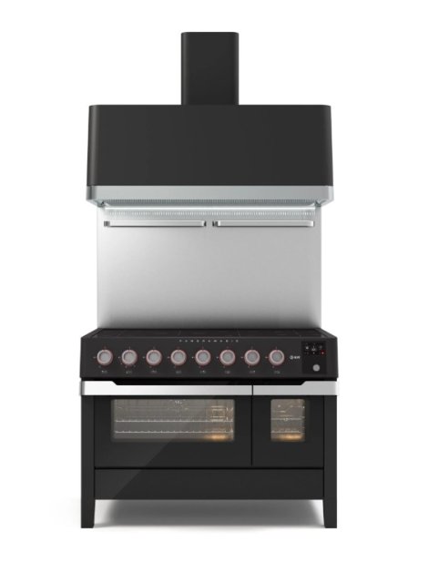 Blocco cottura a libera installazione della linea di elettrodomestici professionali ad uso domestico Panoramagic da 120 cm con doppio forno e 7 zone ad induzione. Disponibile in colore nero opaco e finiture satinate. Il blocco cottura integra un forno elettrico multifunzione da 80 cm con un range di temperatura da 30 a 320°C e un forno elettrico da 30 cm con 8 diverse funzioni e un range di temperatura da 30 a 250°. Il blocco cottura presenta display TFT 4,3″ full touch.