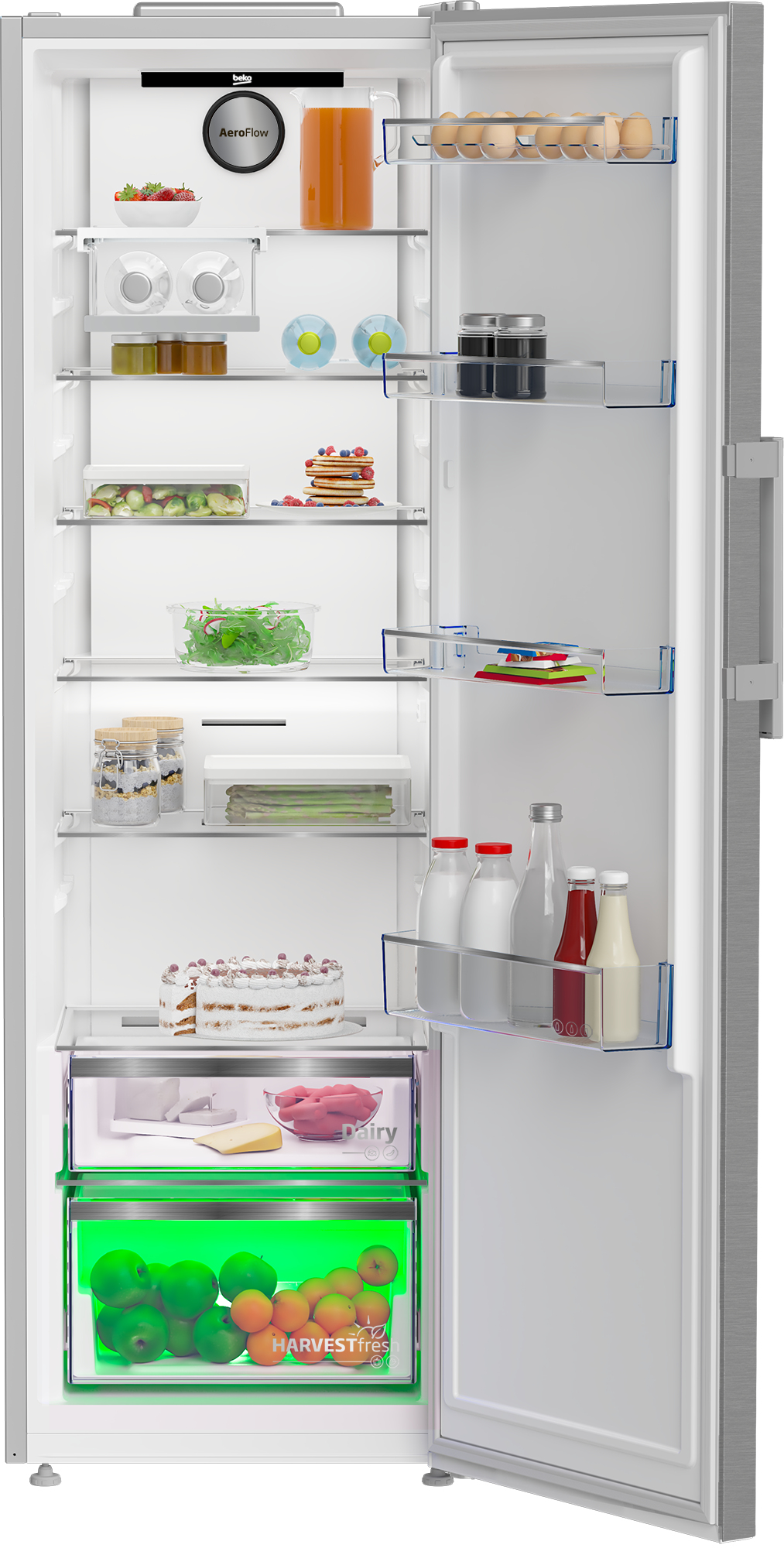 Beko B5RMLNE444HX: Frigorifero Monoporta Beyond, Total No-Frost, 59.5 cm. Capacità netta frigorifero: 365 L, Sistema No-frost, Classe climatica: SN-T, Emissione acustica: 35 dB. Tipo di display: LED, Numero di ripiani frigorifero: 6, Numero di cassetti per verdura: 2. Tipo di lampada: LED. Cerniera porta: Destra. Consumo energetico annuo: 143 kWh, Classe efficienza energetica: E. Peso: 71 kg. Colore del prodotto: Acciaio inox