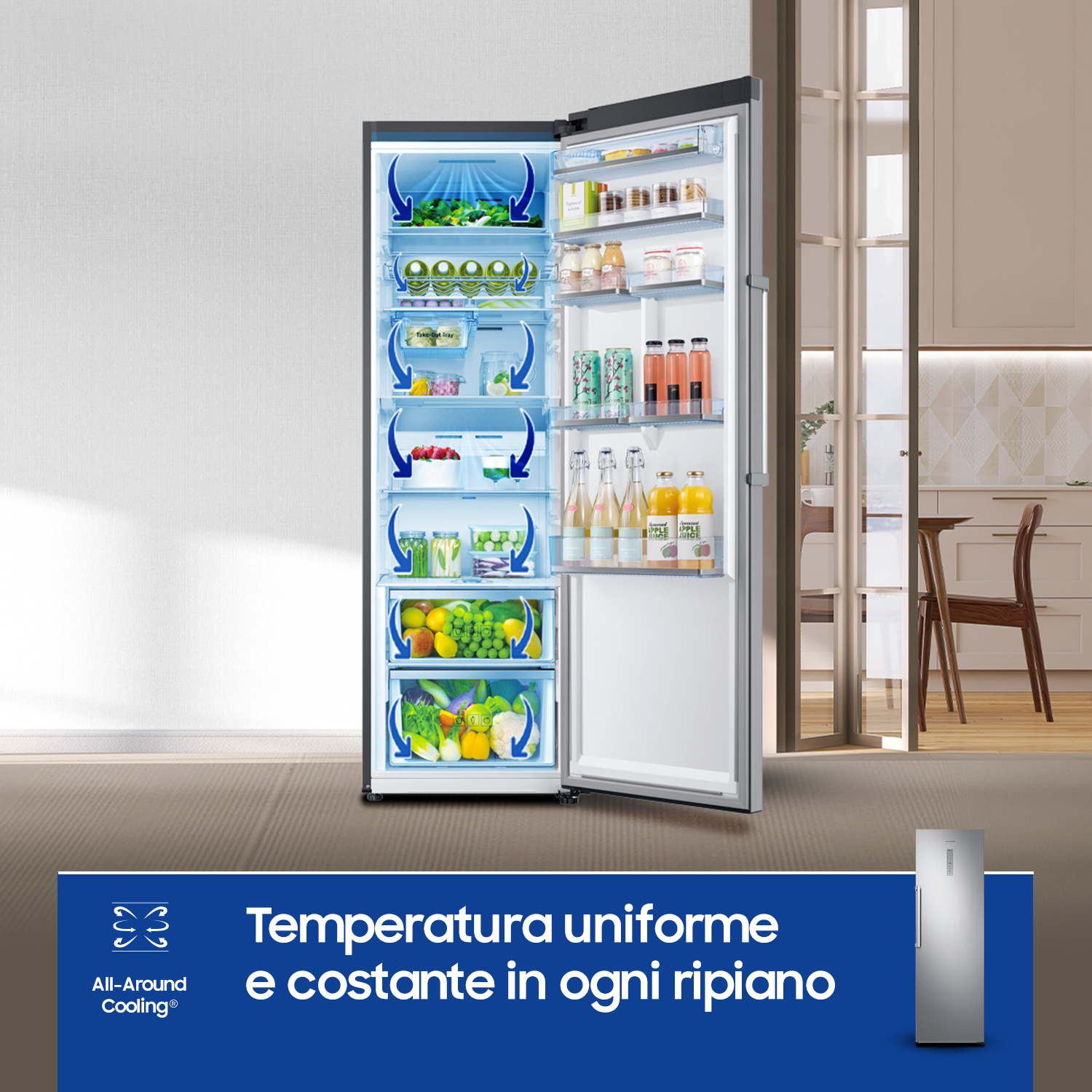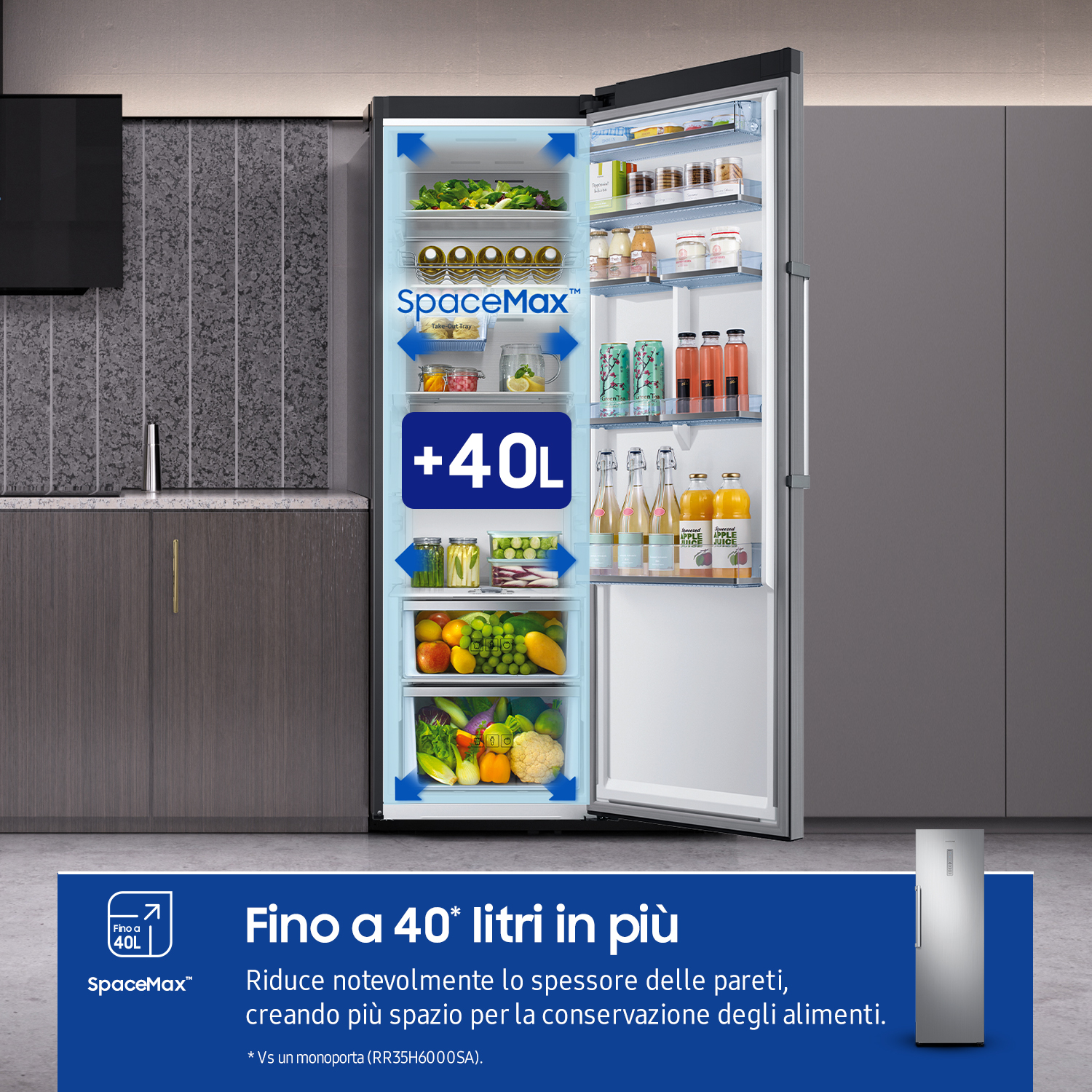 Aumenta lo spazio per la conservazione degli alimenti. L’isolante a elevata efficienza della tecnologia SpaceMax™ consente di ridurre notevolmente lo spessore delle pareti, creando più spazio per la conservazione degli alimenti, senza antiestetiche sporgenze esterne.