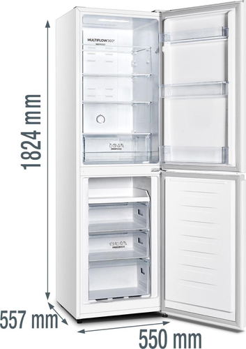 Gorenje NRK418ECW4. Capacità netta totale: 256 L, Classe climatica: SN-ST, Emissione acustica: 41 dB. Capacità netta frigorifero: 171 L, No Frost (frigorifero), Sistema Multi-Airflow (frigorifero), Luce interna, Numero di ripiani frigorifero: 1, Numero di cassetti per verdura: 1. Capacità netta congelatore: 85 L, Capacità di congelamento: 5 kg/24h, No Frost (congelatore). Classe efficienza energetica: E, Consumo energetico annuo: 226 kWh. Colore del prodotto: Bianco