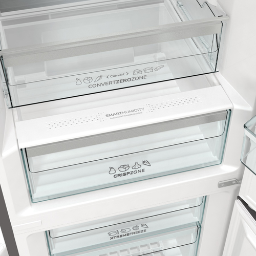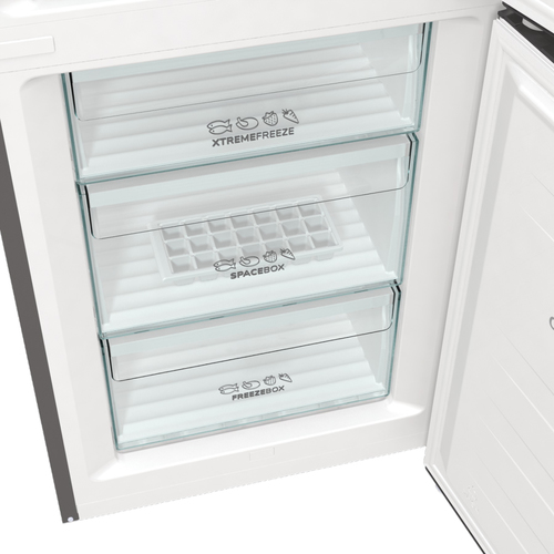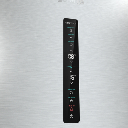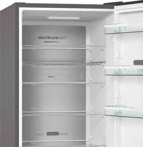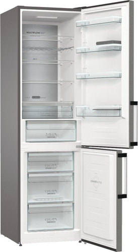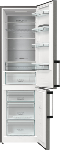 Gorenje NRC6204SXL5M. Capacità netta totale: 361 L. Cerniera porta: Destra, Tipo di display: LCD. Classe climatica: N-T, Emissione acustica: 37 dB. Capacità netta frigorifero: 255 L, No Frost (frigorifero), Sistema Multi-Airflow (frigorifero), Luce interna. Capacità netta congelatore: 106 L, Capacità di congelamento: 13 kg/24h, No Frost (congelatore). Classe efficienza energetica: C, Consumo energetico annuo: 169 kWh. Colore del prodotto: Argento