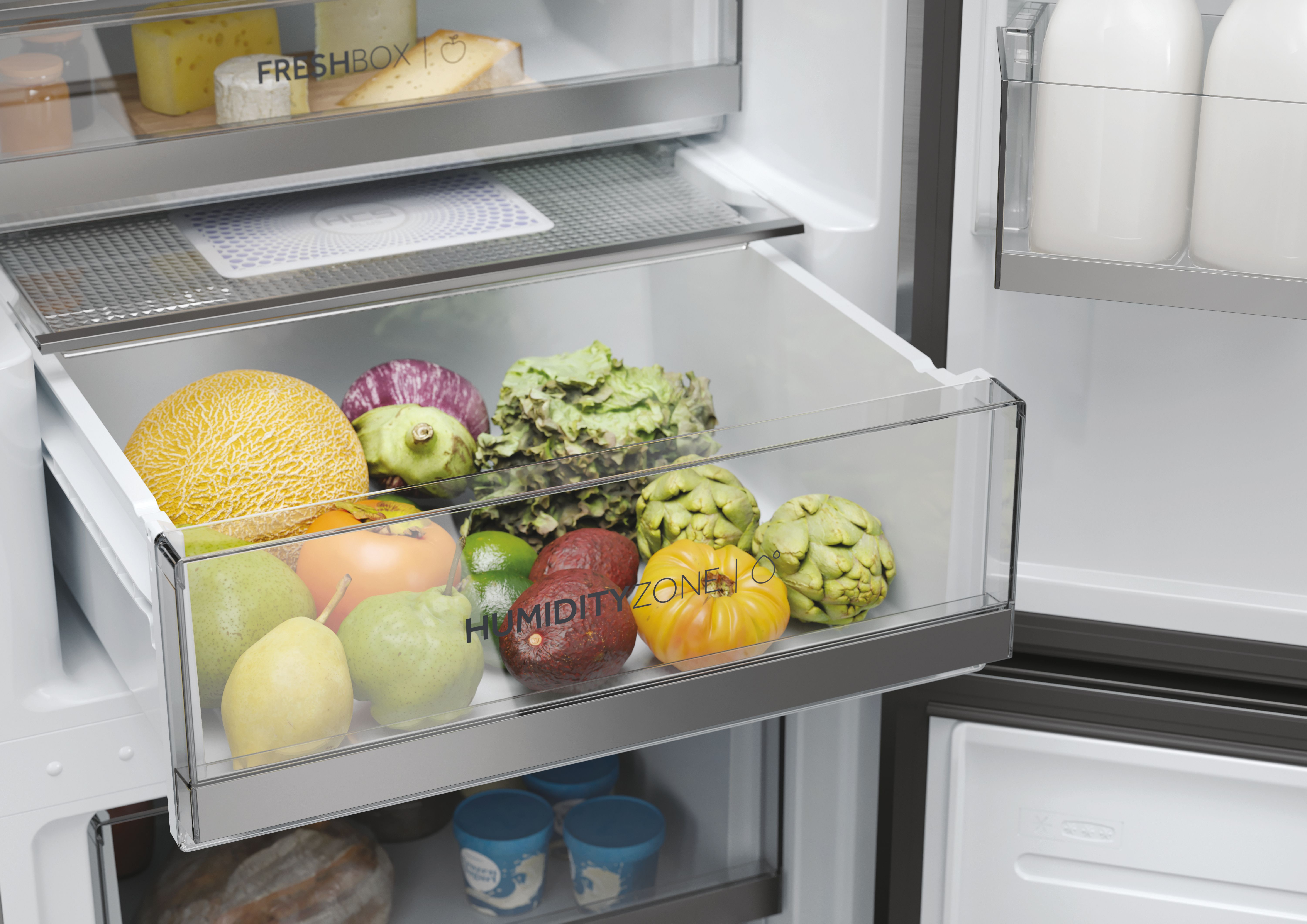 La pratica Humidity Zone di Haier mantiene la tua frutta e verdura più fresca due volte più a lungo*. Ciò avviene grazie alla tecnologia HCS (Humidity Control System), una membrana in fibra vegetale in grado di mantenere l'umidità al 90% e di gestire automaticamente la giusta umidità. In questo modo si evita la formazione di condensa all'interno del cassetto. Mantenendo l'umidità all'interno dello scomparto al 90%, consente comunque la circolazione dell'aria fresca, così puoi conservare la spesa e mantenerne il contenuto nutrizionale più a lungo. *come certificato da VDE N. ID.40046454