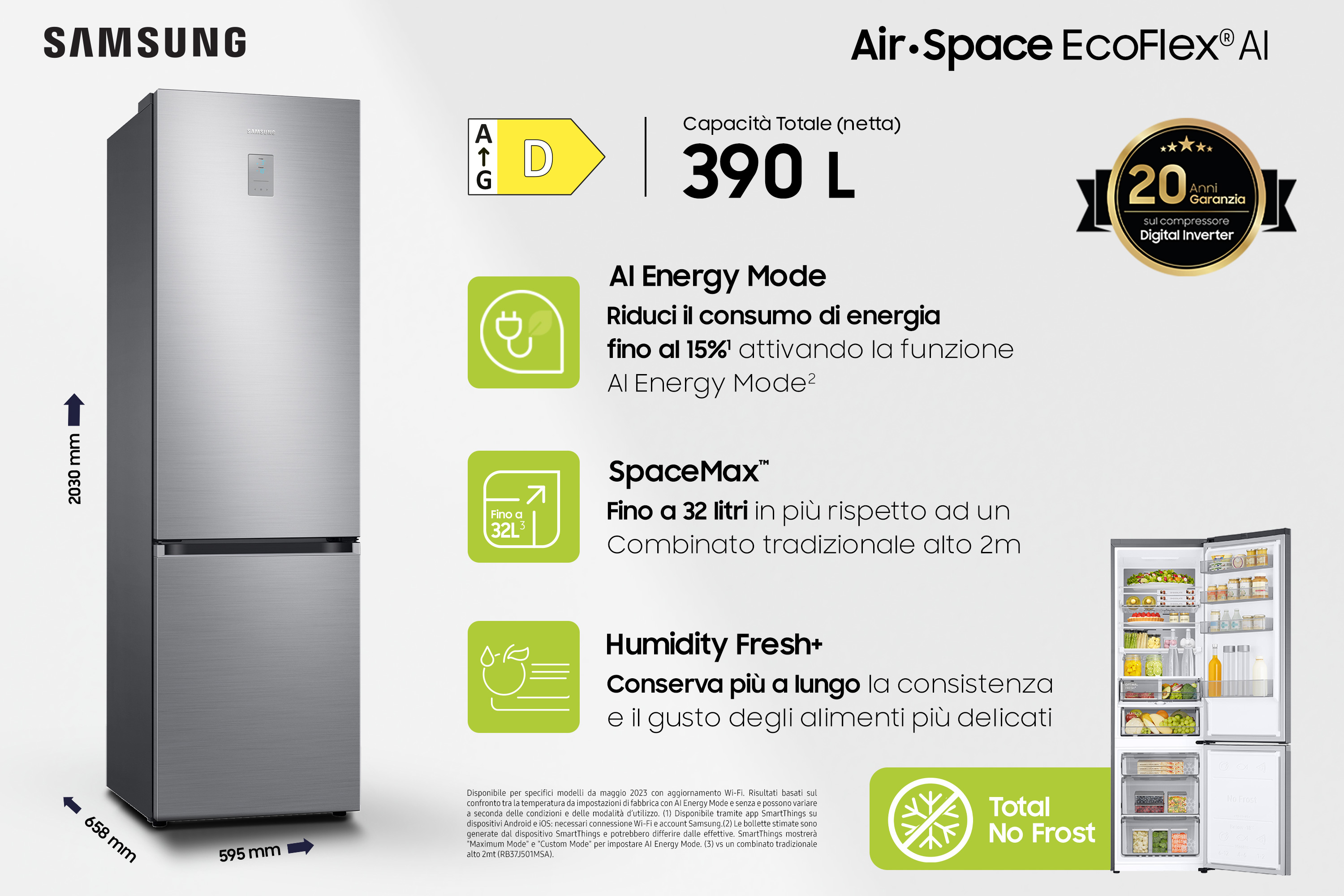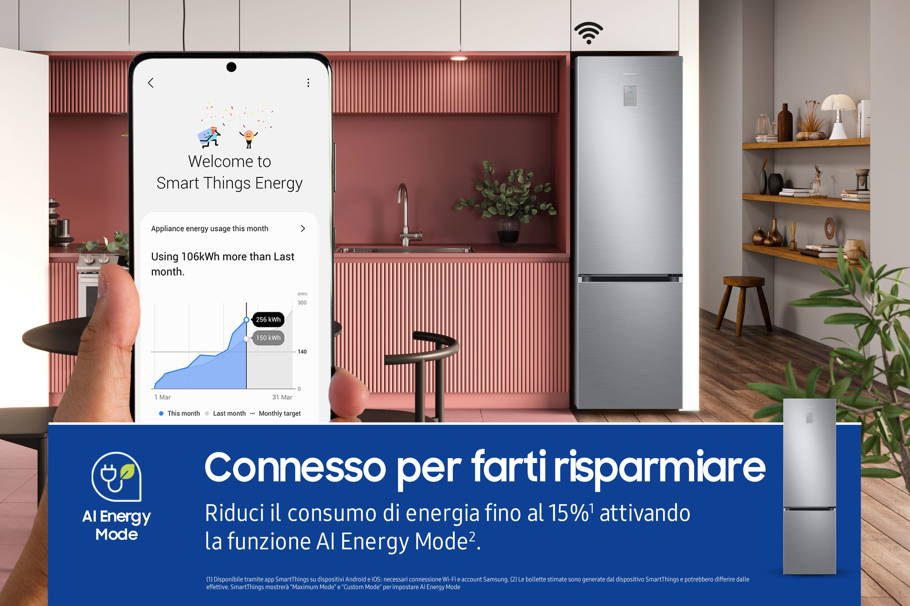 Riduci il consumo di energia fino al 15%[1] attivando la funzione AI Energy Mode[2] che ottimizza il funzionamento del compressore e il ciclo di sbrinamento a seconda delle abitudini di utilizzo.