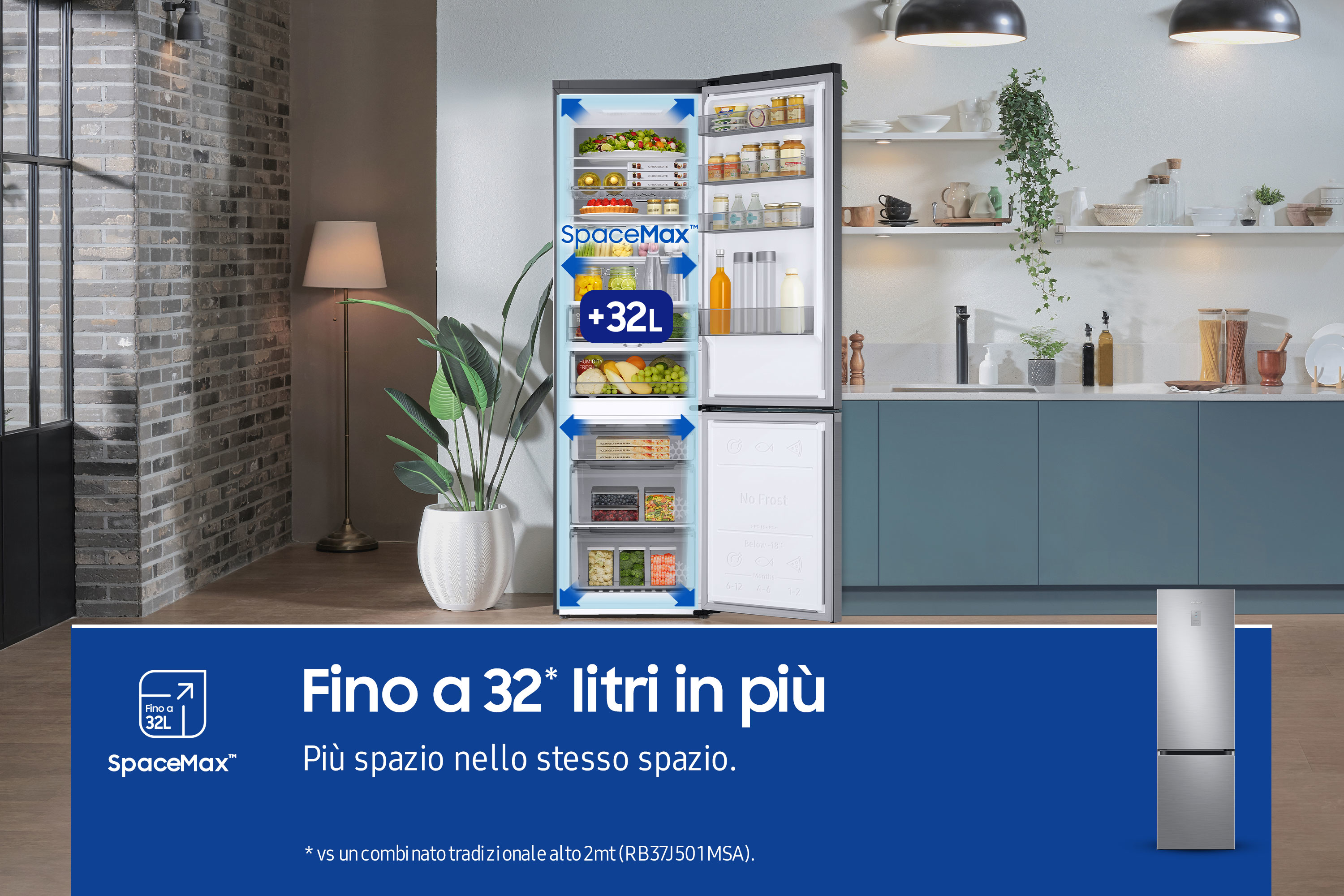 Questo frigorifero, grazie alla tecnologia SpaceMax™, garantisce una capacità interna di 390 litri. Lisolante a elevata efficienza della tecnologia SpaceMax™ consente di ridurre notevolmente lo spessore delle pareti, creando più spazio per la conservazione degli alimenti, senza antiestetiche sporgenze esterne.