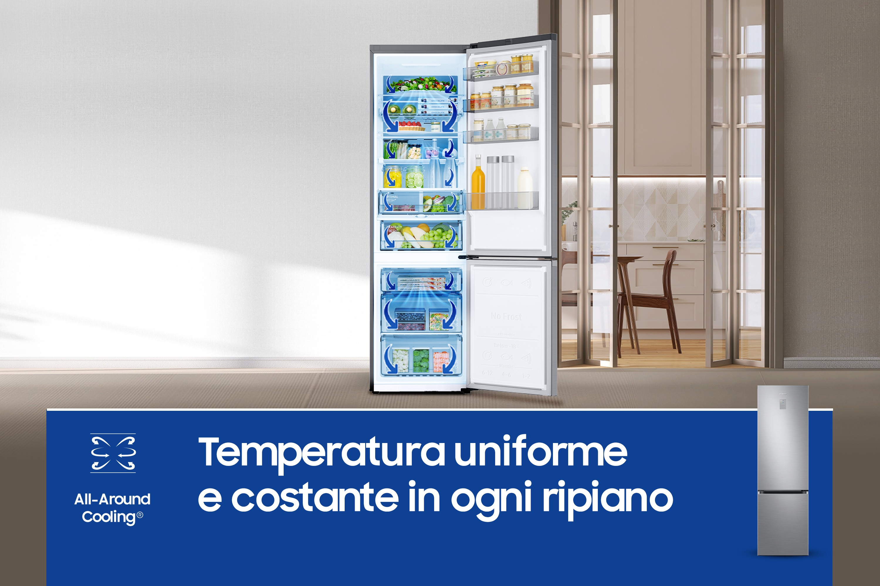 Assicurati che i tuoi alimenti siano adeguatamente refrigerati – in ogni zona del frigorifero. Il sistema All-Around Cooling garantisce un freddo uniforme in ogni zona del frigorifero. Controlla costantemente la temperatura e fa circolare laria fredda attraverso bocchette collocate in posizioni strategiche. In questo modo ogni ripiano viene raffreddato in modo ottimale e gli alimenti rimangono più freschi.
