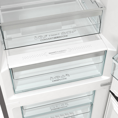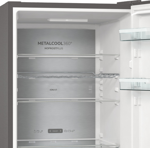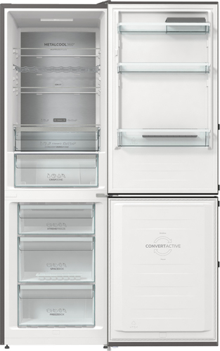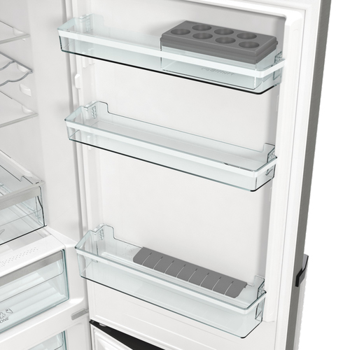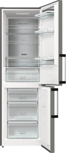 Gorenje NRC6194SXL5M. Capacità netta totale: 326 L. Cerniera porta: Destra, Tipo di display: LED. Classe climatica: SN-ST, Emissione acustica: 35 dB. Capacità netta frigorifero: 194 L, No Frost (frigorifero), Luce interna, Numero di ripiani frigorifero: 4. Capacità netta congelatore: 106 L, Capacità di congelamento: 13 kg/24h. Compartimento zona fresca. Classe efficienza energetica: C, Consumo energetico annuo: 165 kWh. Colore del prodotto: Grigio