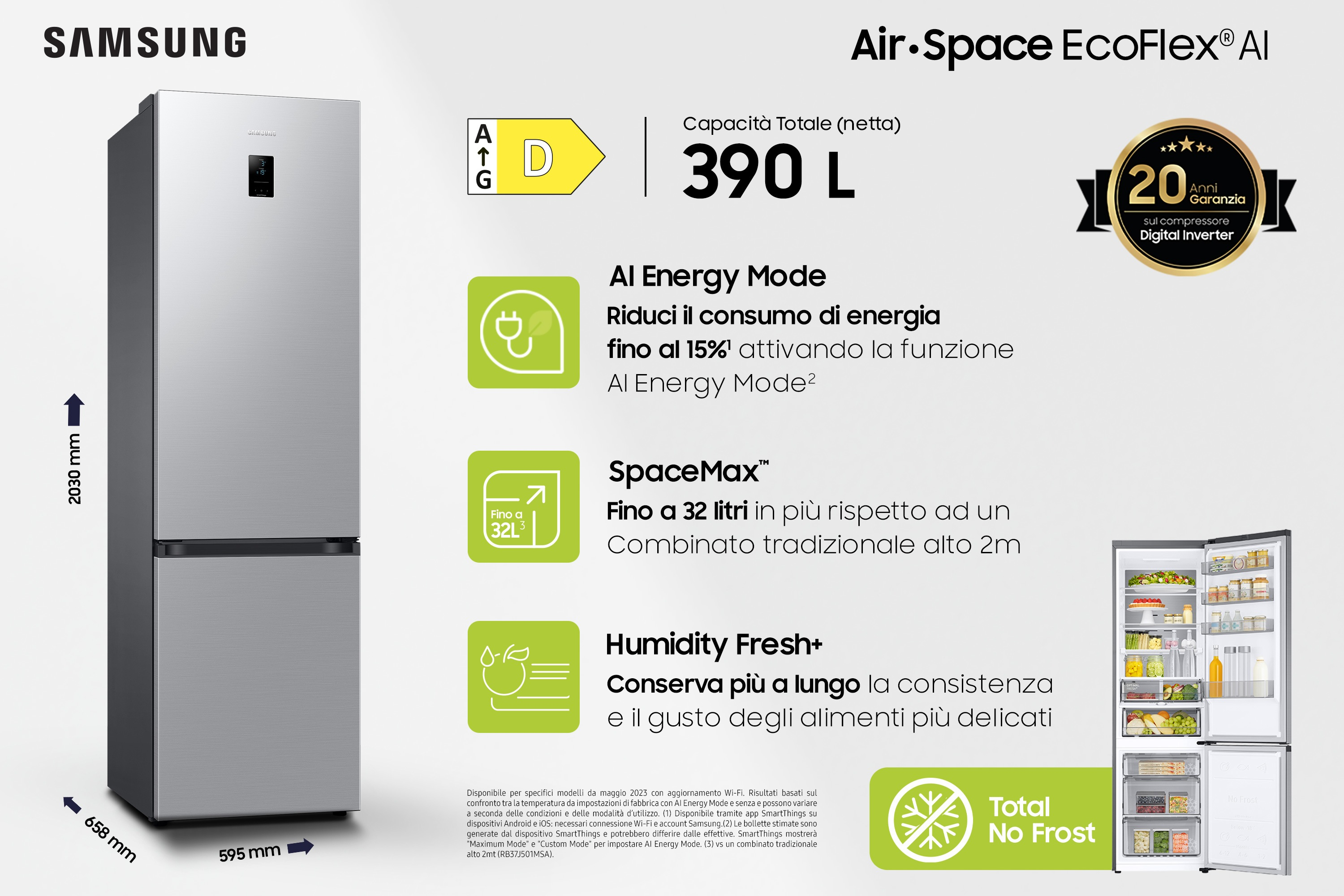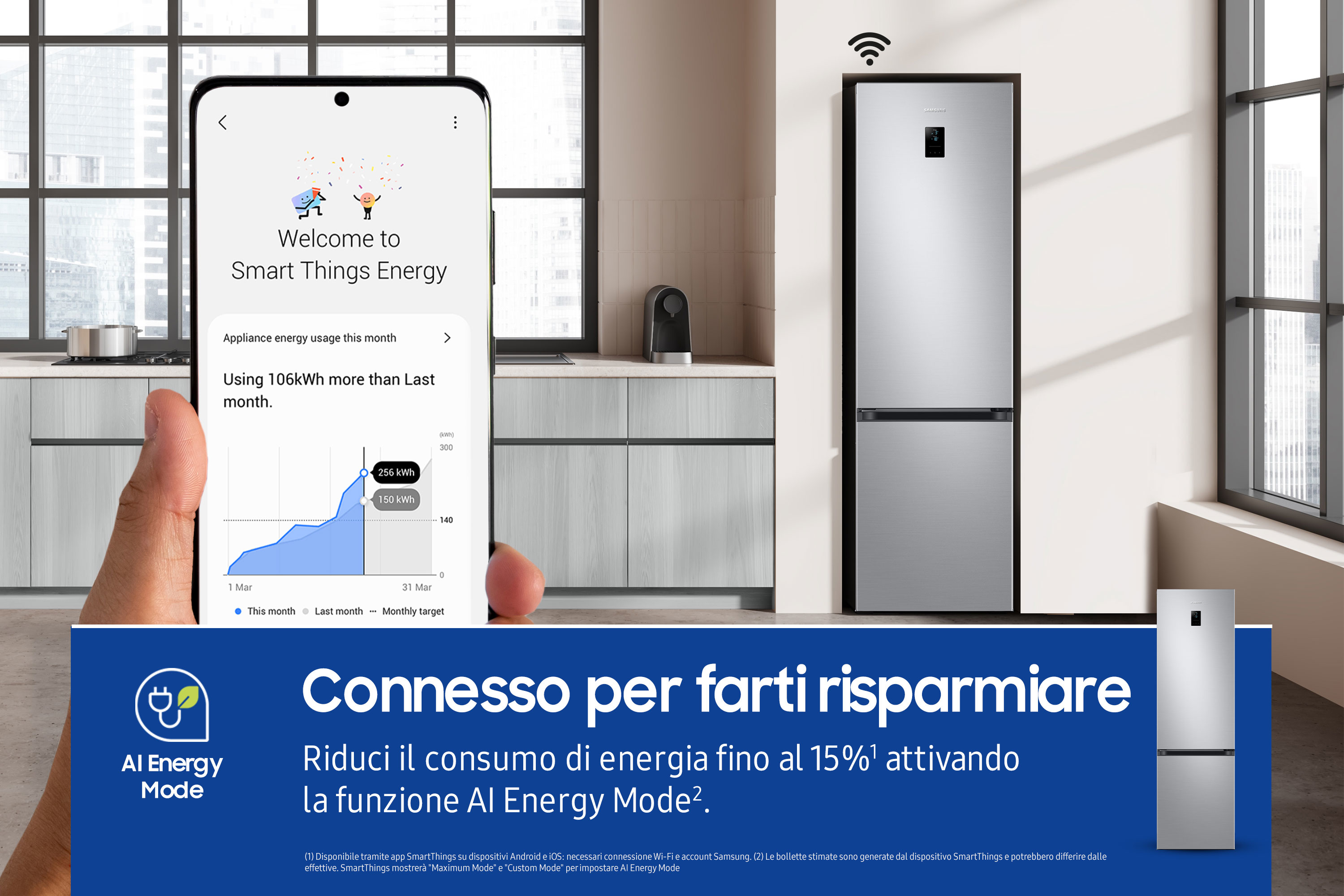 Riduci il consumo di energia fino al 15%[1] attivando la funzione AI Energy Mode[2] che ottimizza il funzionamento del compressore e il ciclo di sbrinamento a seconda delle abitudini di utilizzo.