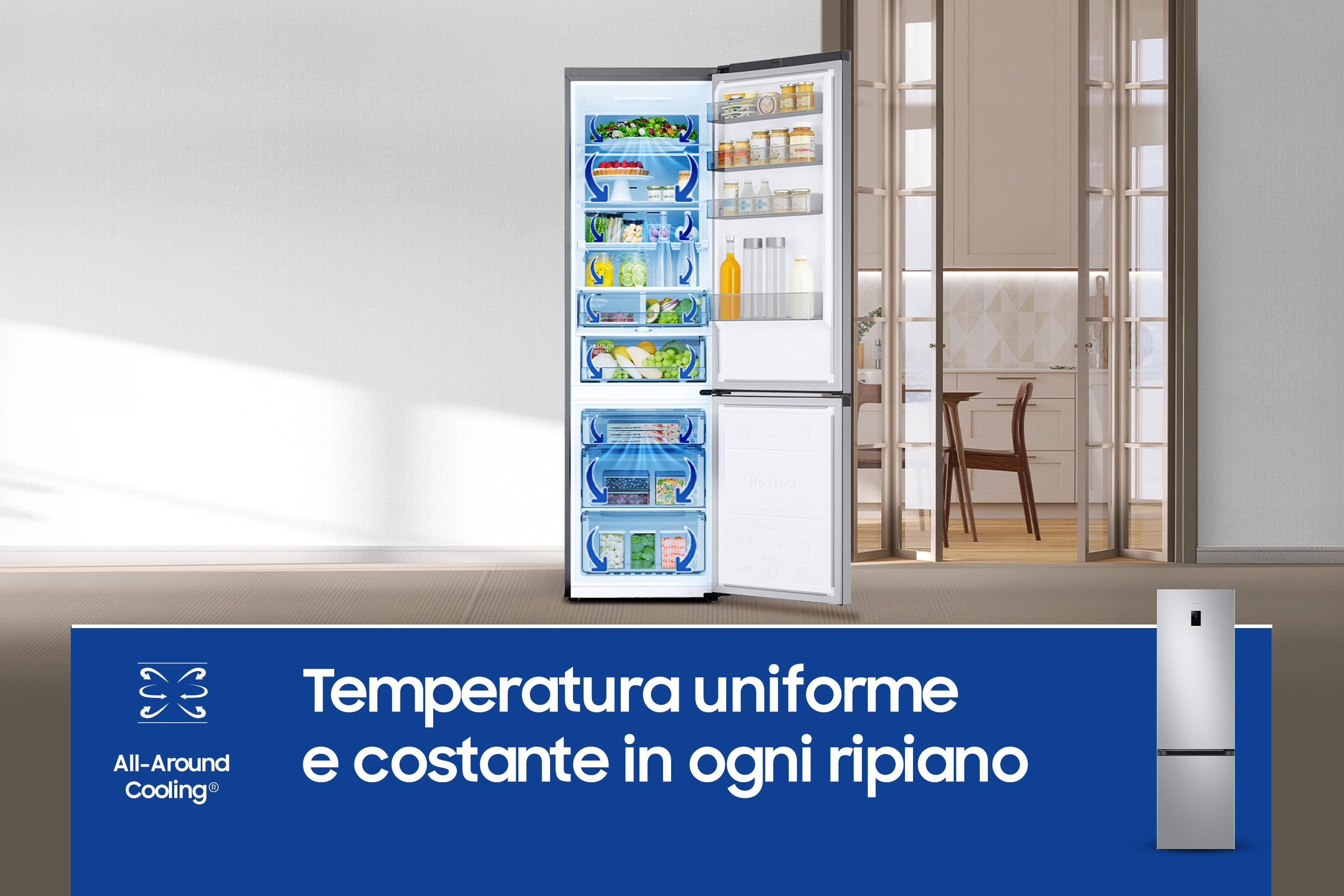 Assicurati che i tuoi alimenti siano adeguatamente refrigerati – in ogni zona del frigorifero. Il sistema All-Around Cooling garantisce un freddo uniforme in ogni zona del frigorifero. Controlla costantemente la temperatura e fa circolare laria fredda attraverso bocchette collocate in posizioni strategiche. In questo modo ogni ripiano viene raffreddato in modo ottimale e gli alimenti rimangono più freschi.