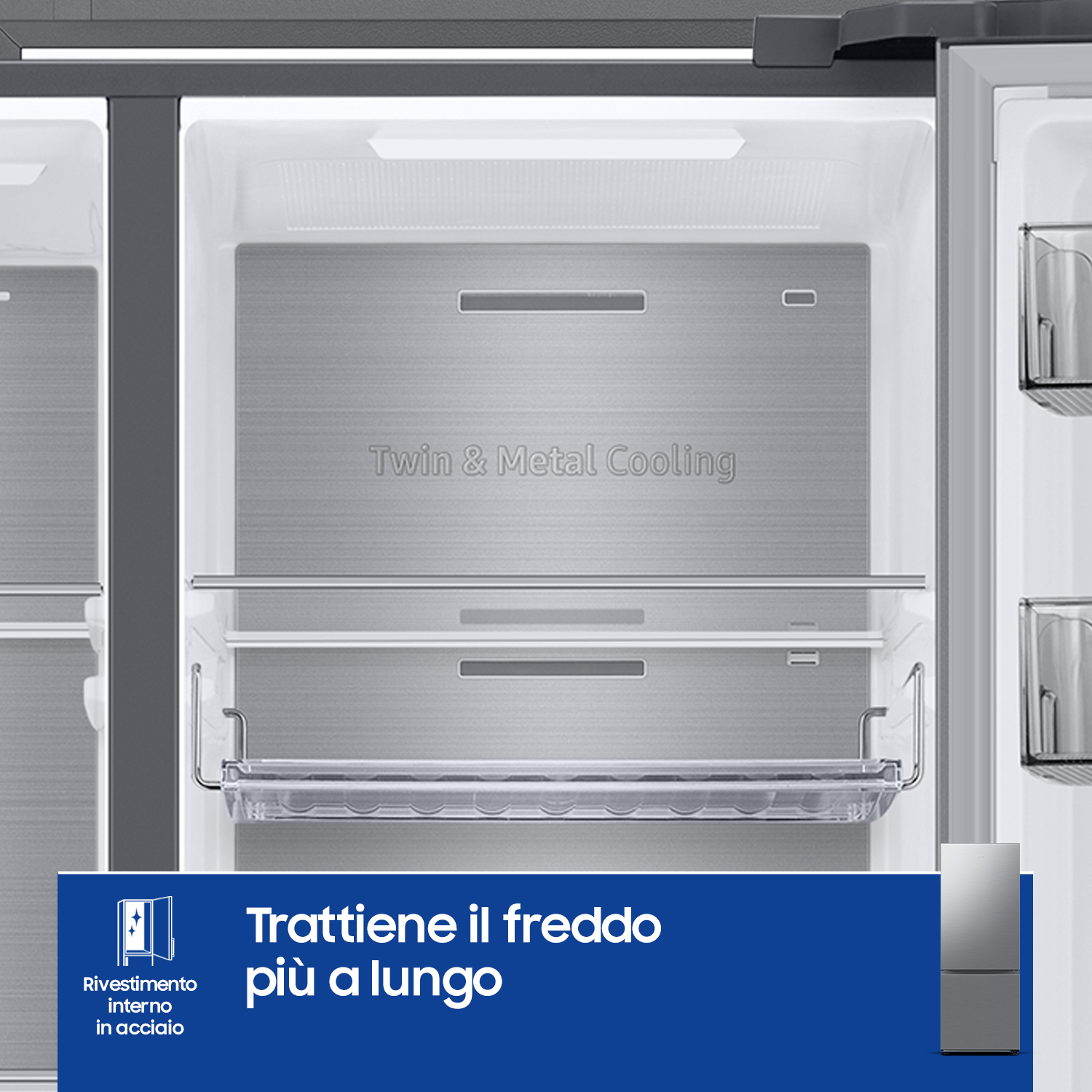 Mantieni la temperatura interna ottimale, per preservare la freschezza dei cibi anche se la porta viene aperta di frequente. Il pannello e il condotto Metal Cooling trattengono il freddo e compensano ogni perdita di calore. Inoltre aggiungono una nota di eleganza e sono molto facili da pulire.