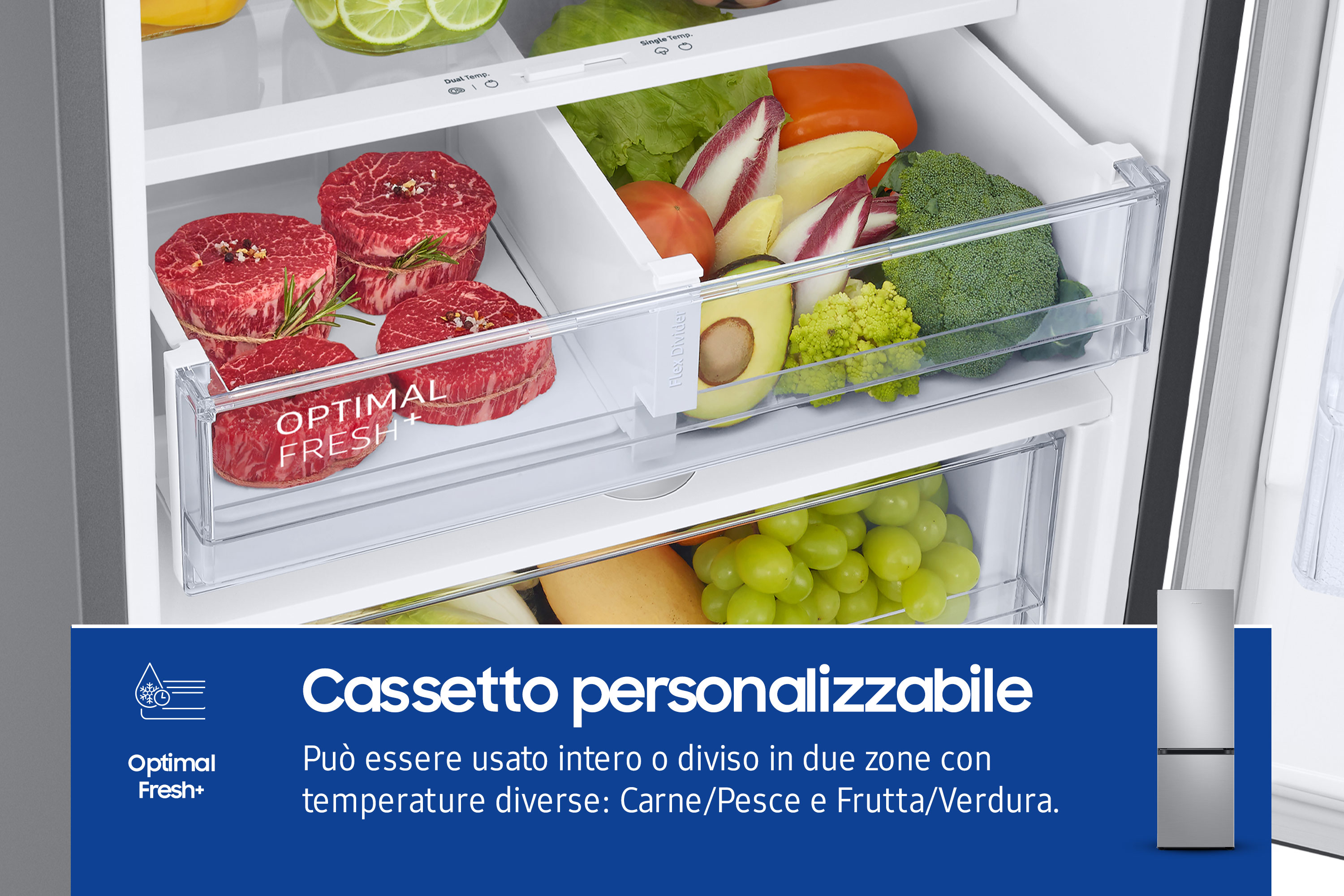 Il comparto Optimal Fresh + può essere utilizzato come cassetto unico o diviso in due zone con temperature diverse. Il lato sinistro è più freddo, per cui carne e pesce possono durare due volte più a lungo[3]. Il lato destro è ideale per preservare la freschezza di frutta e verdura.