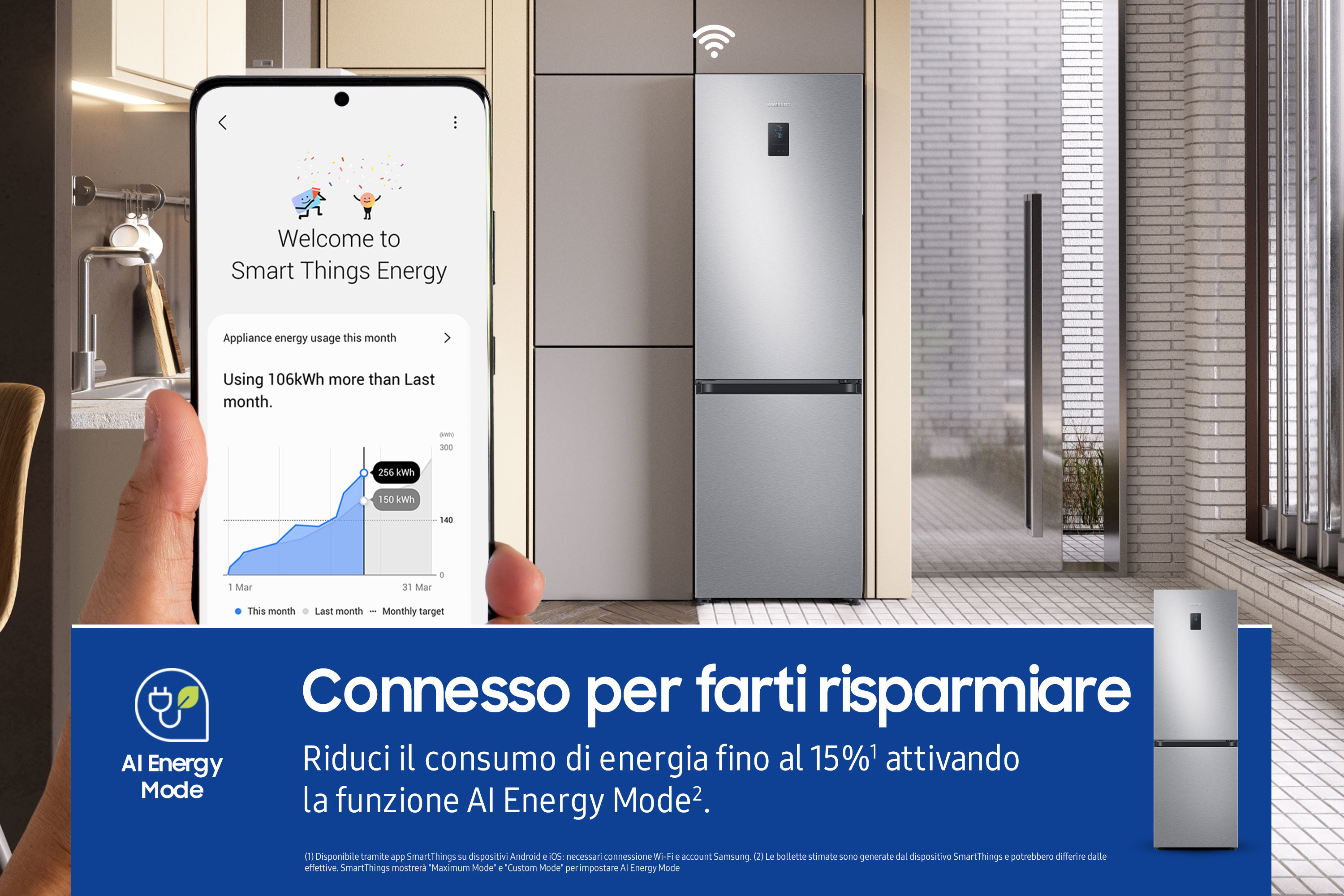 Riduci il consumo di energia fino al 15%[1] attivando la funzione AI Energy Mode[2] che ottimizza il funzionamento del compressore e il ciclo di sbrinamento a seconda delle abitudini di utilizzo.