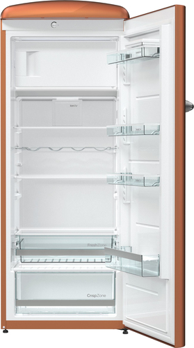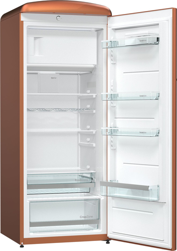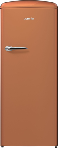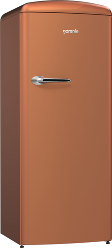 Gorenje ORB153CR. Posizionamento dell'apparecchio: Libera installazione, Colore del prodotto: Rame, Tipo di controllo: Manopola. Capacità netta totale: 254 L, Classe climatica: SN-T, Emissione acustica: 40 dB. Capacità netta frigorifero: 229 L, Capacità lorda frigorifero: 235 L, Tipo di lampada: LED. Capacità netta congelatore: 25 L, Posizione del congelatore: Posto in alto, Capacità di congelamento: 2 kg/24h. Consumo energetico annuo: 124 kWh, Classe di efficienza energetica (vecchia): A+++, Carico di collegamento: 80 W