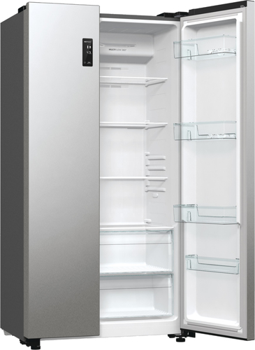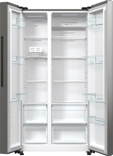 Gorenje NRR9185EAXL. Posizionamento dell'apparecchio: Libera installazione, Design del prodotto: Porta americana, Colore del prodotto: Argento. Capacità netta totale: 550 L, Classe climatica: N-ST, Classe emissione rumore: C. Capacità netta frigorifero: 358 L, Tipo di lampada: LED. Capacità netta congelatore: 192 L, Posizione del congelatore: Posizionato lateralmente, Capacità di congelamento: 11 kg/24h. Classe efficienza energetica: E, Consumo energetico annuo: 318 kWh, Scala di efficienza energetica: Da A a G