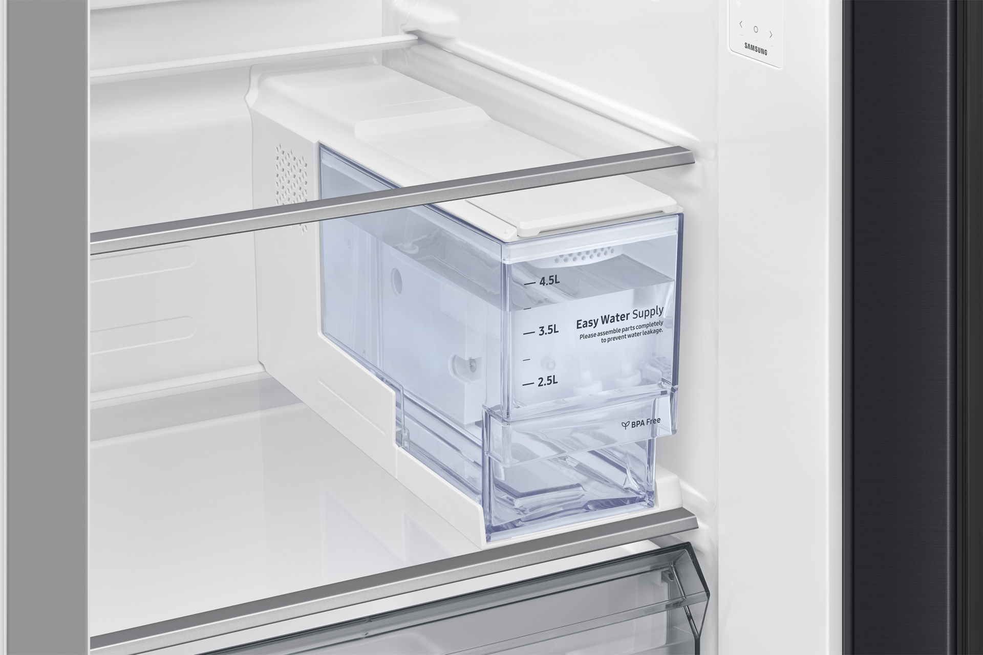 Installa il frigorifero ovunque tu voglia senza perdere tempo con tubature o condutture disordinate. Dispone di un grande serbatoio d'acqua da 4,5 litri, privo di BPA[10] , per il dispenser di acqua e ghiaccio senza allacciamento idrico. In questo modo, potrai installarlo praticamente ovunque. E non dovrai nemmeno perdere tempo a cambiare regolarmente il filtro dellacqua.