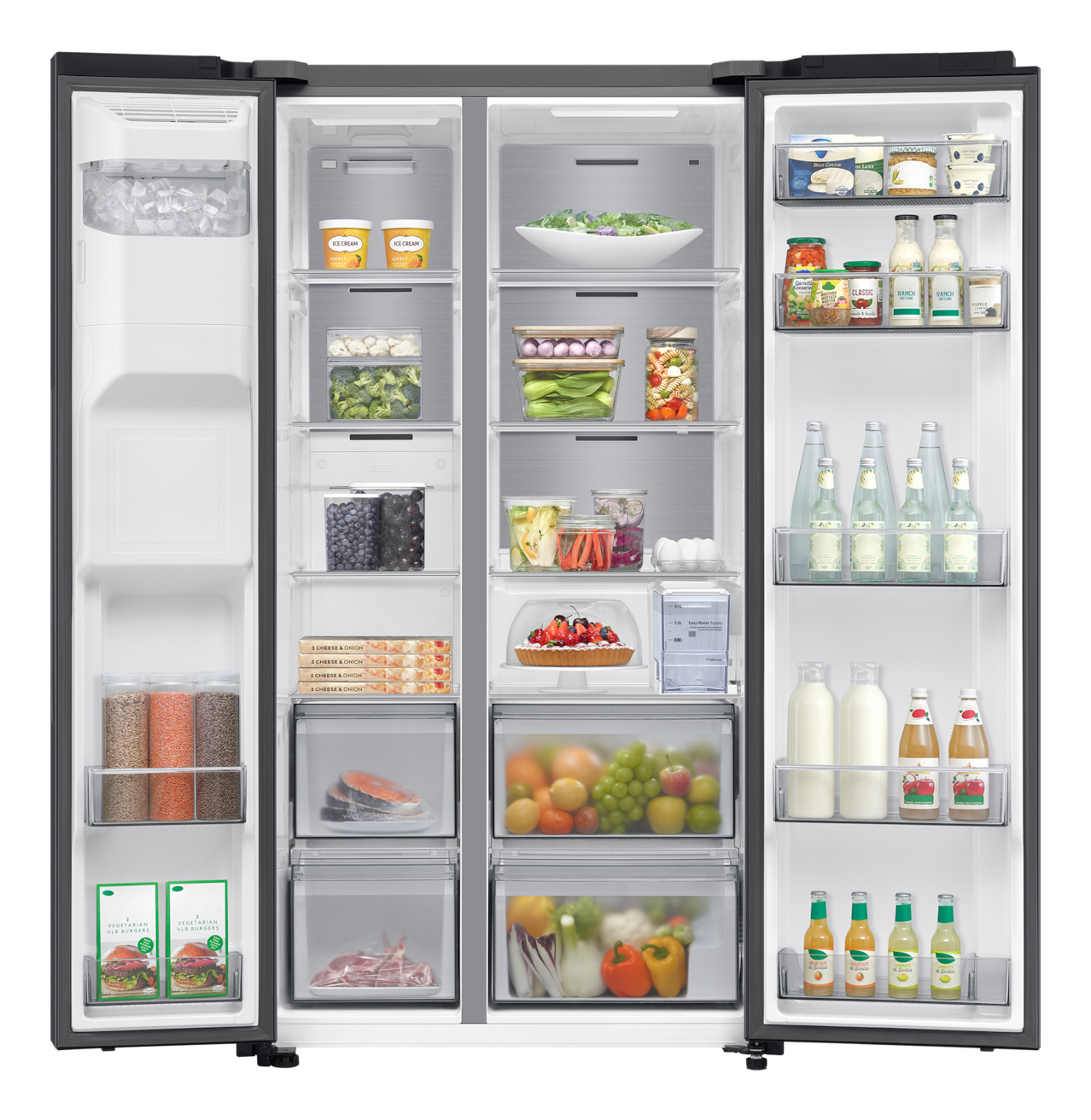 Samsung Frigorifero Side By Side 640L RS70F65KEFEF. Posizionamento dell'apparecchio: Libera installazione, Design del prodotto: Porta americana, Colore del prodotto: Nero. Capacità netta totale: 640 L, Classe climatica: Starfish, Classe emissione rumore: C. Capacità netta frigorifero: 420 L, Tipo di lampada: LED. Capacità netta congelatore: 220 L, Posizione del congelatore: Posizionato lateralmente, Capacità di congelamento: 13 kg/24h. Applicazioni per il controllo supportate: SmartThings