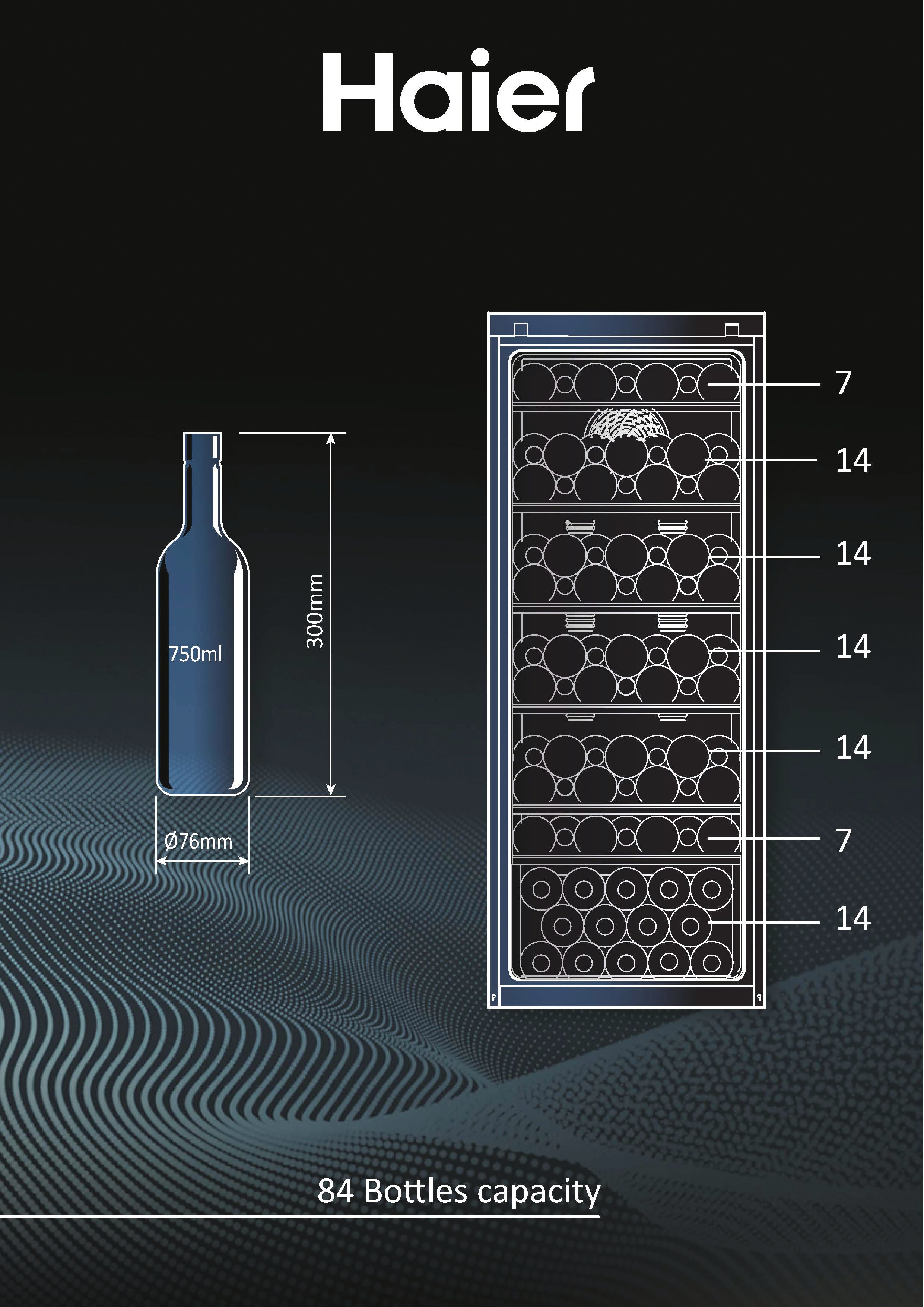 Haier Wine Bank 50 Serie 5 HWS84GA. Posizionamento dell'apparecchio: Libera installazione, Colore struttura: Nero, Colore interno: Nero. Capacità bottiglie: 84 bottiglia/bottiglie, Tipo di prodotto: Cantinetta vino con compressore, Classe climatica: Starfish. Tipo di controllo: Pulsanti, Tipo di display: LED, Tipo di lampada: LED. Classe efficienza energetica: G, Consumo energetico annuo: 149 kWh, Scala di efficienza energetica: Da A+ a G. Larghezza: 497 mm, Profondità: 585 mm, Altezza: 1270 mm