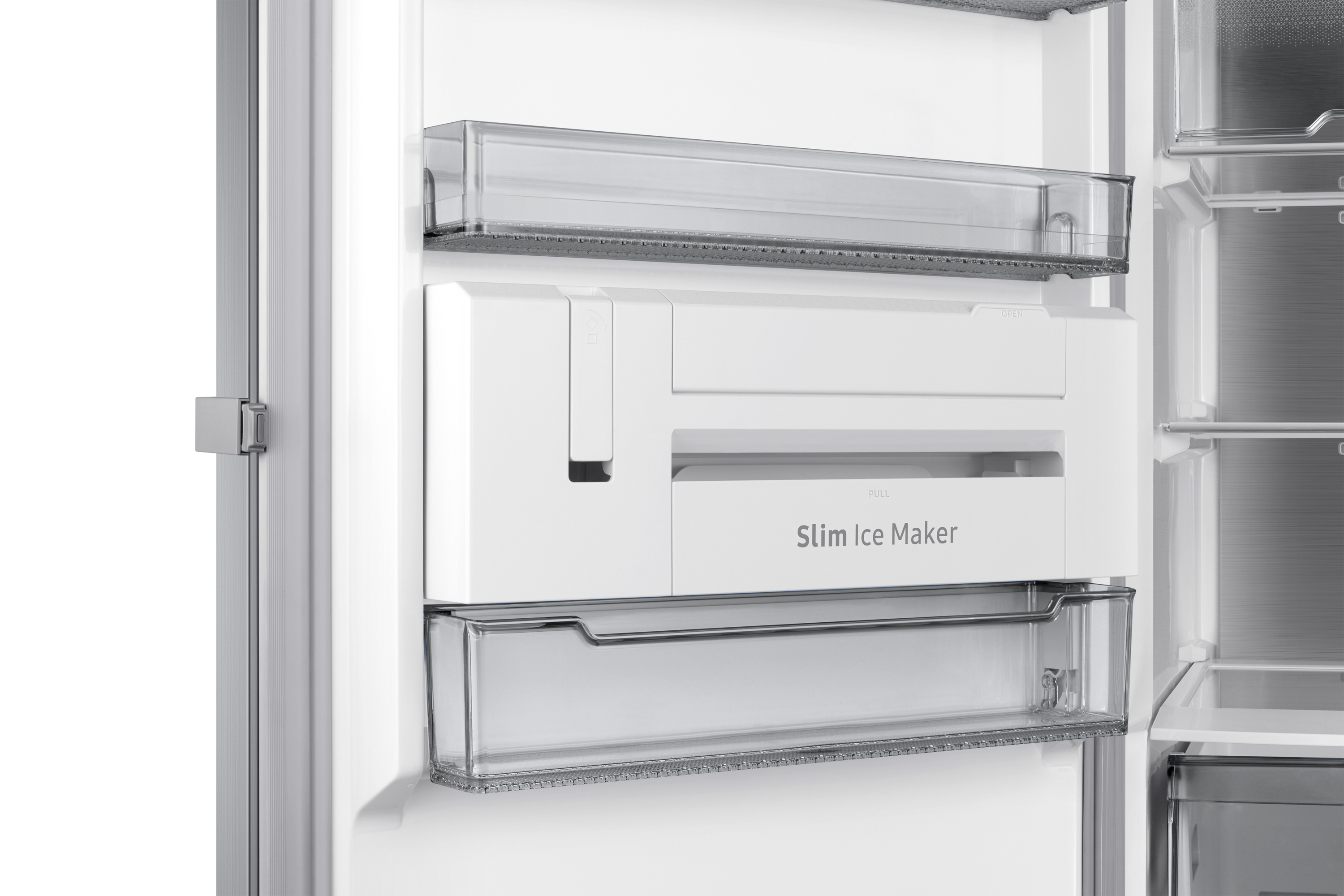 La macchina del ghiaccio Slim, integrata nella porta, ti permette di avere ancora più spazio libero sugli scaffali. Non preoccuparti, non rimarrai a corto di ghiaccio; la macchina del ghiaccio Slim può conservare fino a 5 volte la quantità di ghiaccio che produce, ti basterà girare una manopola per avere sempre dei cubetti di ghiaccio a tua disposizione.