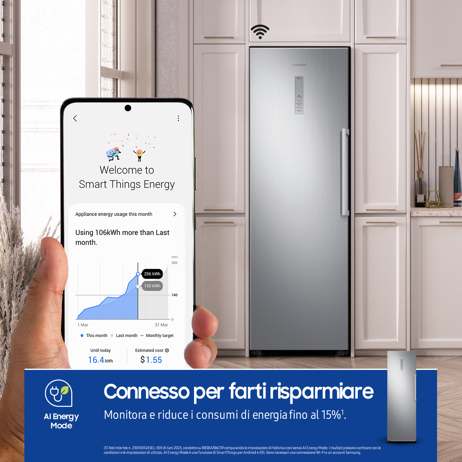Riduci il consumo di energia fino al 15%[1] attivando la funzione AI Energy Mode[2] che ottimizza il funzionamento del compressore e il ciclo di sbrinamento a seconda delle abitudini di utilizzo.