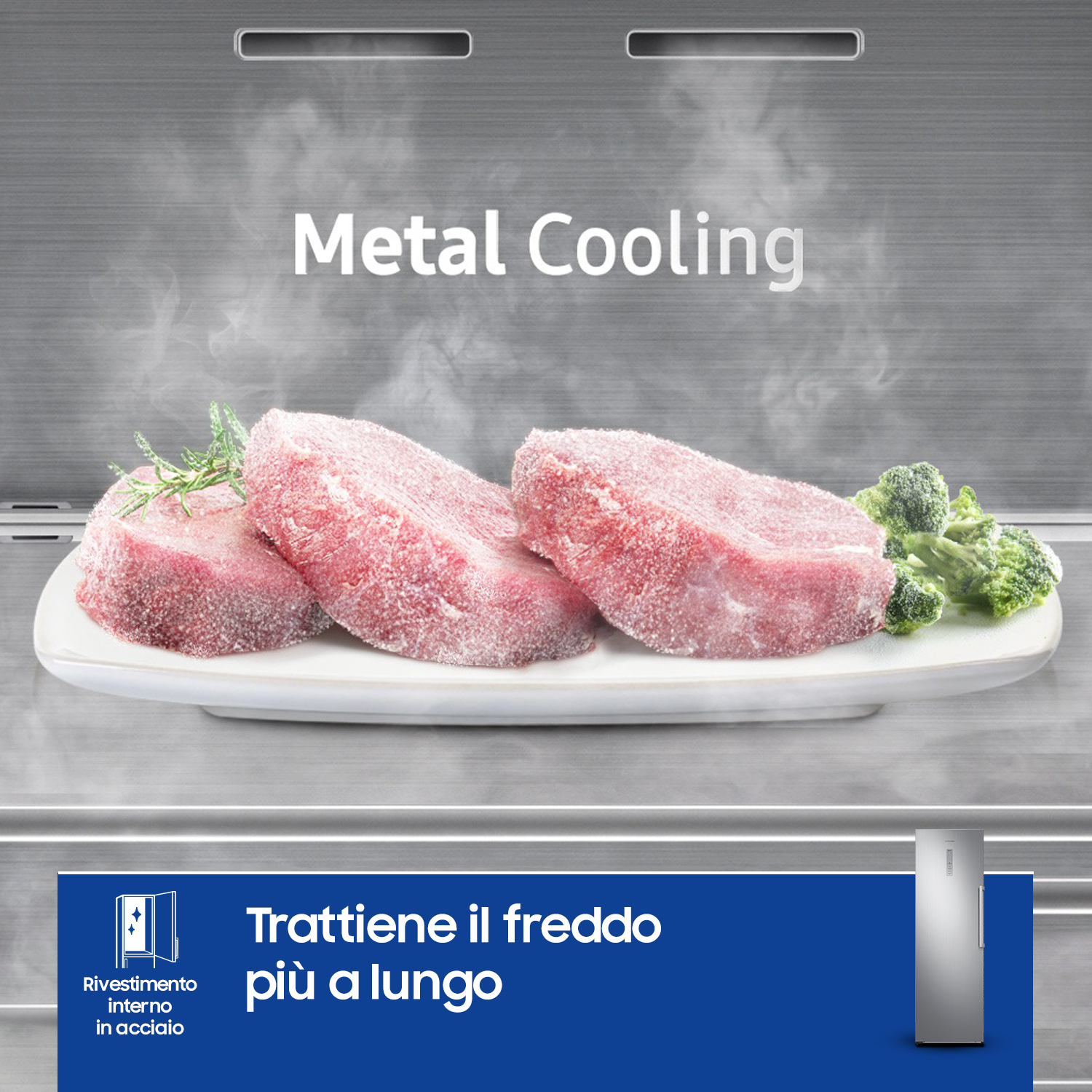 Mantieni la temperatura interna ottimale, per preservare la freschezza dei cibi anche se la porta viene aperta di frequente. Il pannello Metal Cooling posizionato nella parete di fondo trattiene il freddo e compensa subito eventuali perdite di calore. Inoltre, aggiunge una nota di eleganza ed è facilissimo da pulire.