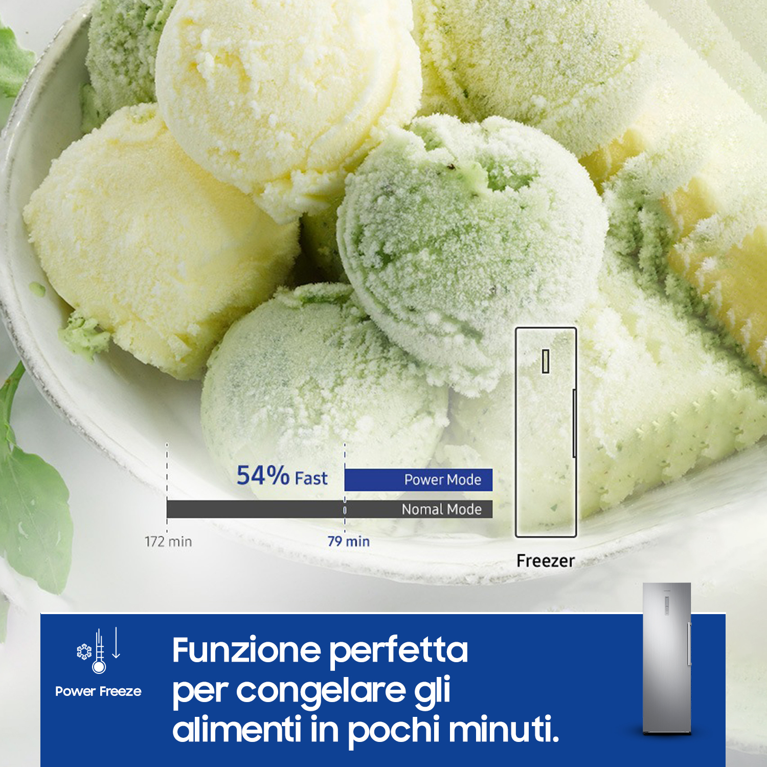 Queste funzioni assicurano un raffreddamento rapido per le bevande e la produzione di ghiaccio. Premendo semplicemente un pulsante, la funzione Power Cool immette un flusso d'aria fredda nel congelatore per surgelare o raffreddare rapidamente i cibi, mentre la funzione Power Freeze è la soluzione ideale per surgelare e conservare i cibi (ad esempio il gelato) o produrre più ghiaccio.