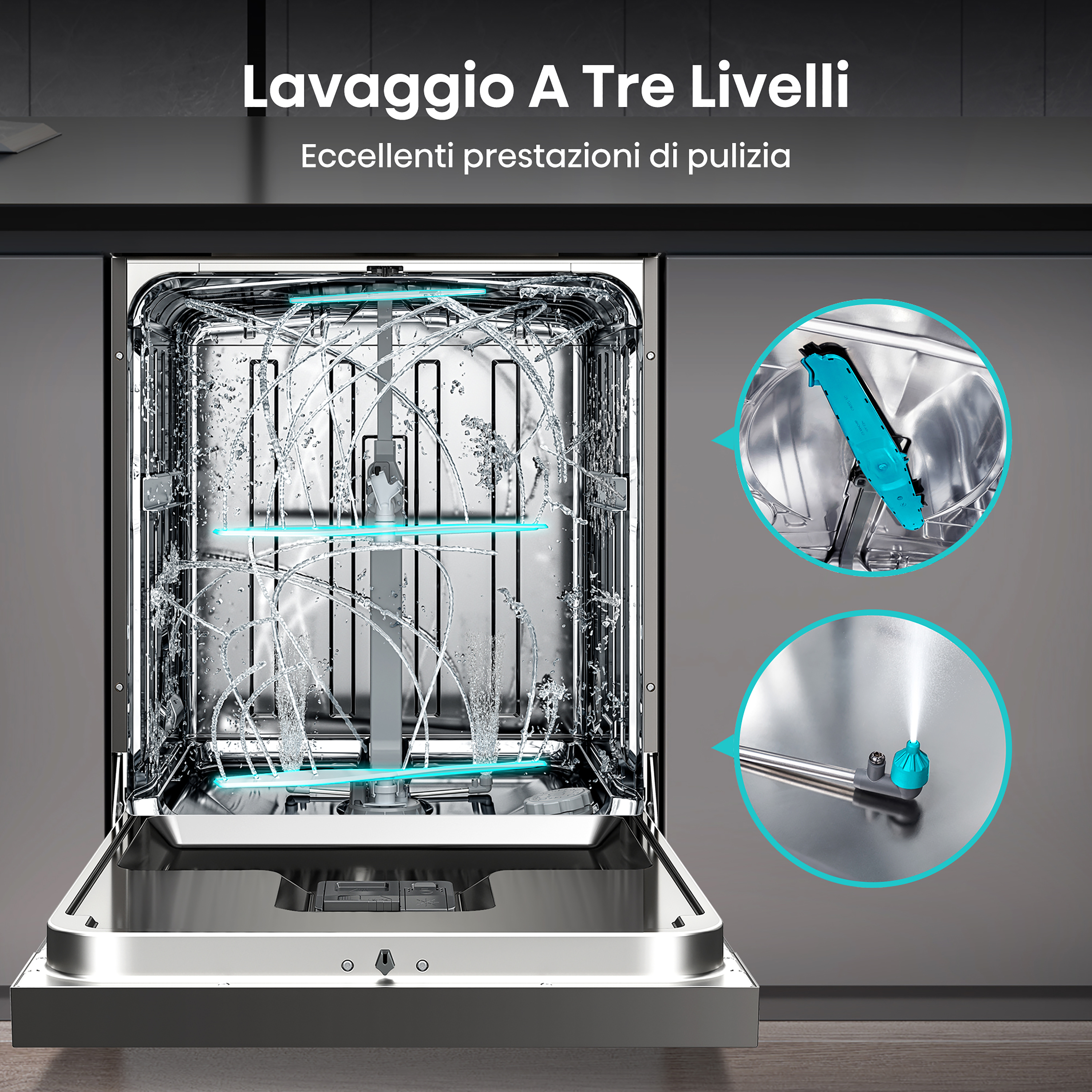 Il terzo braccio irroratore si trova attaccato al soffitto della vasca e garantisce una miglior distribuzione dell'acqua. In questo modo, i risultati di lavaggio sono migliorati del 30% rispetto ai modelli che non ne sono provvisti.