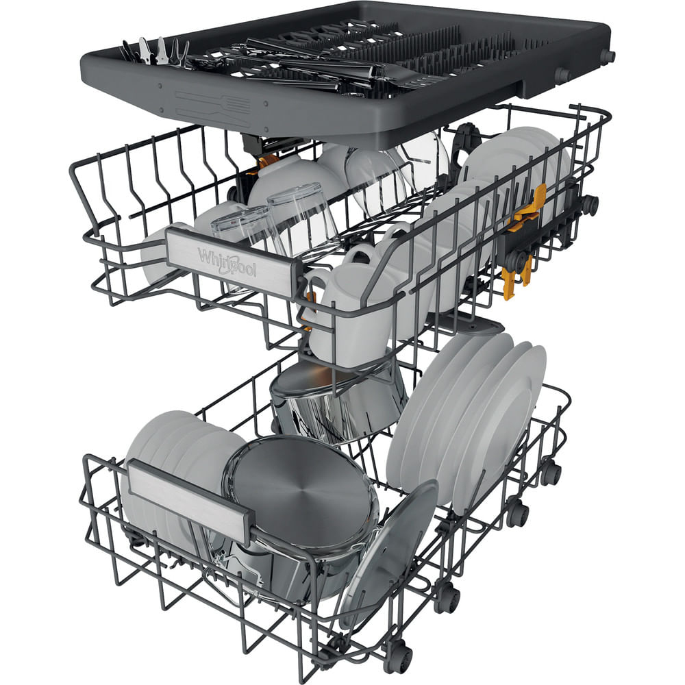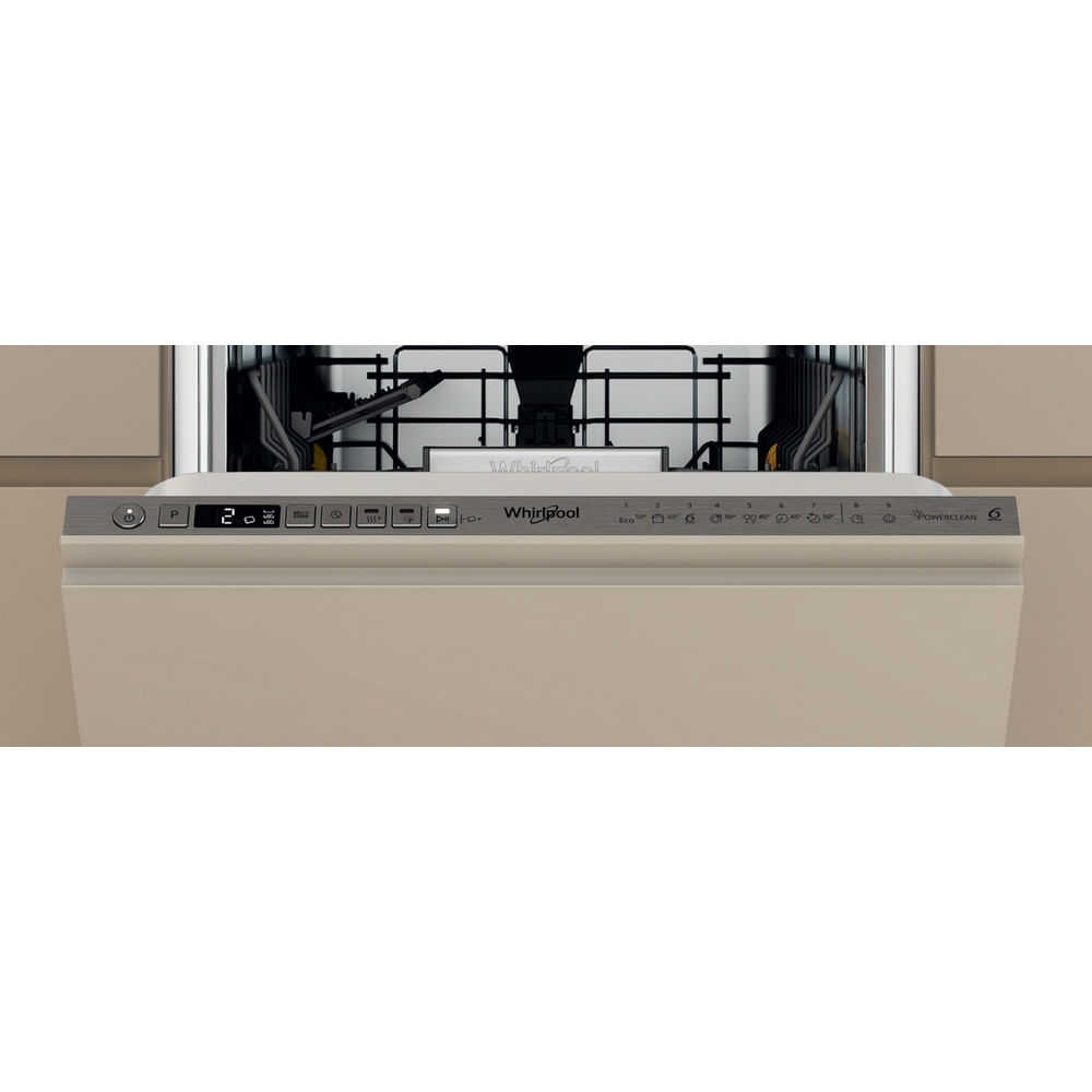 Whirlpool Lavastoviglie 45 cm, classe B, 10 coperti, terzo cesto fisso. Posizionamento dell'apparecchio: A scomparsa totale, Dimensione: Compatta (45 cm), Colore pannello di controllo: Acciaio inox. Numero di coperti: 10 coperti, Classe emissione rumore: B, Emissione acustica: 42 dB. Classe efficienza energetica: B, Consumo di acqua per ciclo: 8,7 L, Consumo energetico per 100 cicli: 51 kWh. Larghezza: 448 mm, Profondità: 555 mm, Altezza: 820 mm. Larghezza imballo: 500 mm, Profondità imballo: 675 mm, Altezza imballo: 890 mm