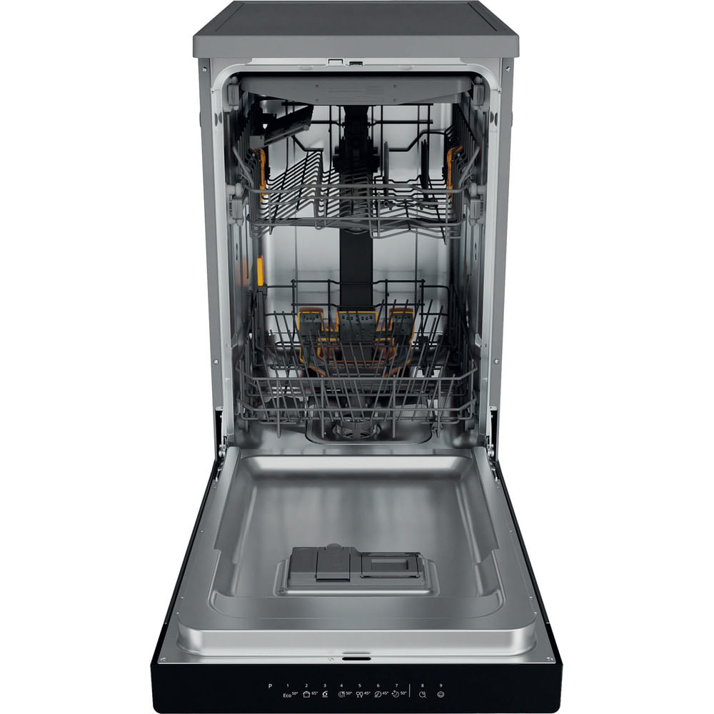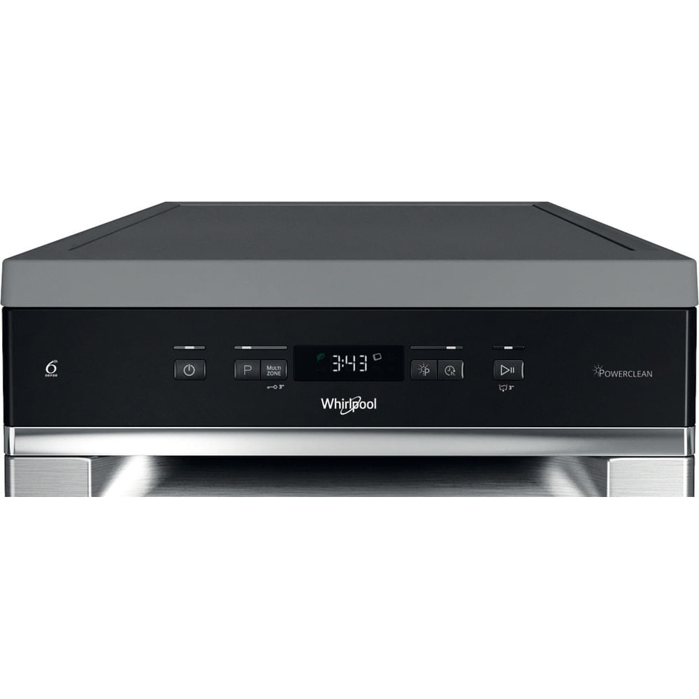 Whirlpool Lavastoviglie FS 45 cm classe D, 11 coperti, Terzo cesto, 6° senso, PowerCleanPro, Inox. Posizionamento dell'apparecchio: Libera installazione, Dimensione: Compatta (45 cm), Colore della porta: Acciaio inox. Numero di coperti: 11 coperti, Classe emissione rumore: C, Emissione acustica: 46 dB. Classe efficienza energetica: D, Consumo di acqua per ciclo: 8,7 L, Consumo energetico per 100 cicli: 72 kWh. Larghezza: 450 mm, Profondità: 590 mm, Altezza: 850 mm. Tecnologie Whirlpool (lavaggio stoviglie): 6TH SENSE, FlexiSpace, Natural Dry, Powerclean Pro