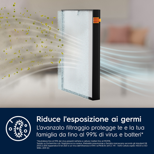 Neutralizza il 99,99% dei batteri intrappolati e filtra il 99% dei virus trasmessi per via aerea* mantenendo te e la tua famiglia più sani.