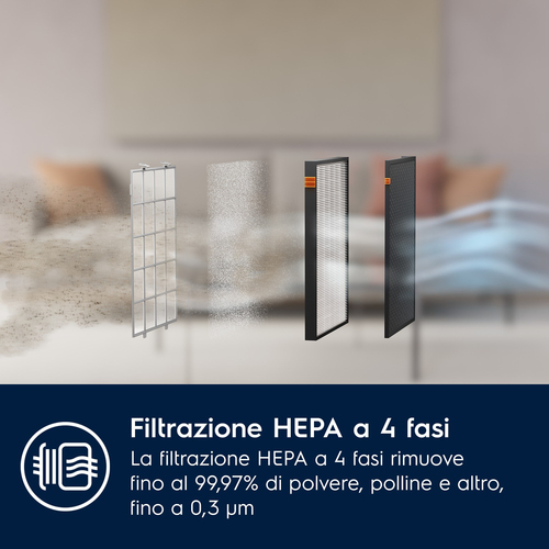 Il filtraggio antibatterico/virus a 4 fasi con prefiltro, HEPA e carbone attivo può filtrare fino al 99,97% di particelle sospese aeree pari a 0,3 micron (μm). Ad esempio, polvere in casa, peli di animali domestici, polline di alberi ed erba