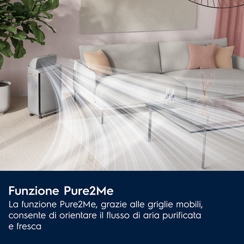 Un purificatore ad alte prestazioni con l'innovativo sistema di flusso dell'aria Pure2Me. La cappa regolabile insieme ai deflettori oscillanti con 3 diverse opzioni, erogano un flusso di aria purificata, fresca, dove ne hai bisogno.