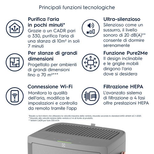 *In base a test interni in una stanza di 10 m², utilizzando la massima velocità della ventola, misurata secondo lo standard ANSI-AHAM AC-1-2020. Per un CADR di 330.