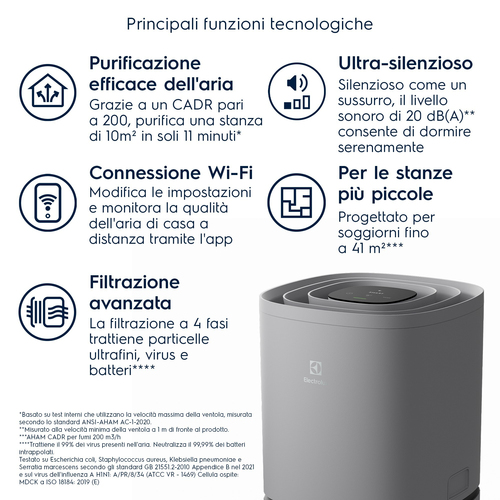 Il filtraggio HEPA, per ridurre l'esposizione alla polvere in casa, peli di animali domestici, polline di alberi ed erba. Il filtraggio antibatterico/virus a 4 fasi con prefiltro e carbone attivo può filtrare fino al 99,97% di particelle sospese aeree pari a 0,3 micron di dimensione (μm)