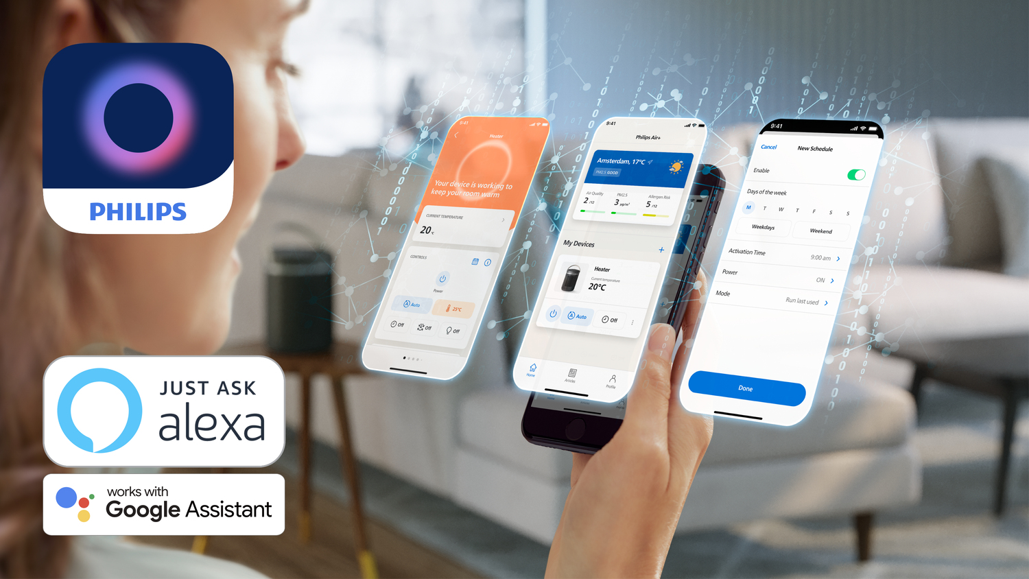 Collega il termoventilatore all'app Air+ per monitorare la qualità dell'aria interna ed esterna e usufruire del controllo da remoto e dei comandi vocali tramite Google e Alexa. Nell'app, seleziona la modalità Auto+ dotata di tecnologia AI: si adatta alla tua routine riducendo al minimo il rumore e il consumo energetico.