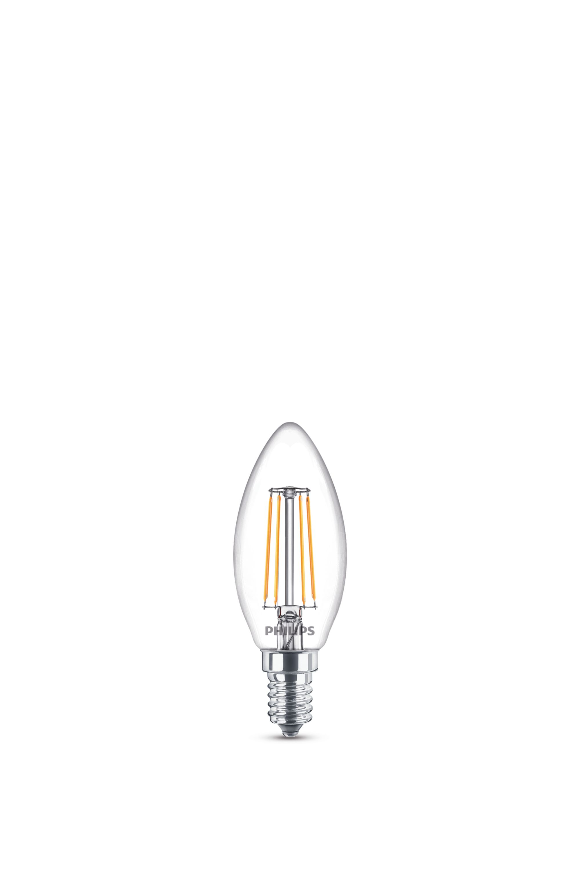 Philips Candela. Potenza lampadina: 4 W, Lampadina di potenza equivalente: 40 W, Attacco lampada: E14, Flusso luminoso: 470 lm, Durata della lampadina: 15000 h, Colore della luce: Bianco caldo, Temperatura colore: 2700 K, Color Rendering Index (CRI): 80, Fattore di potenza: 0,4
