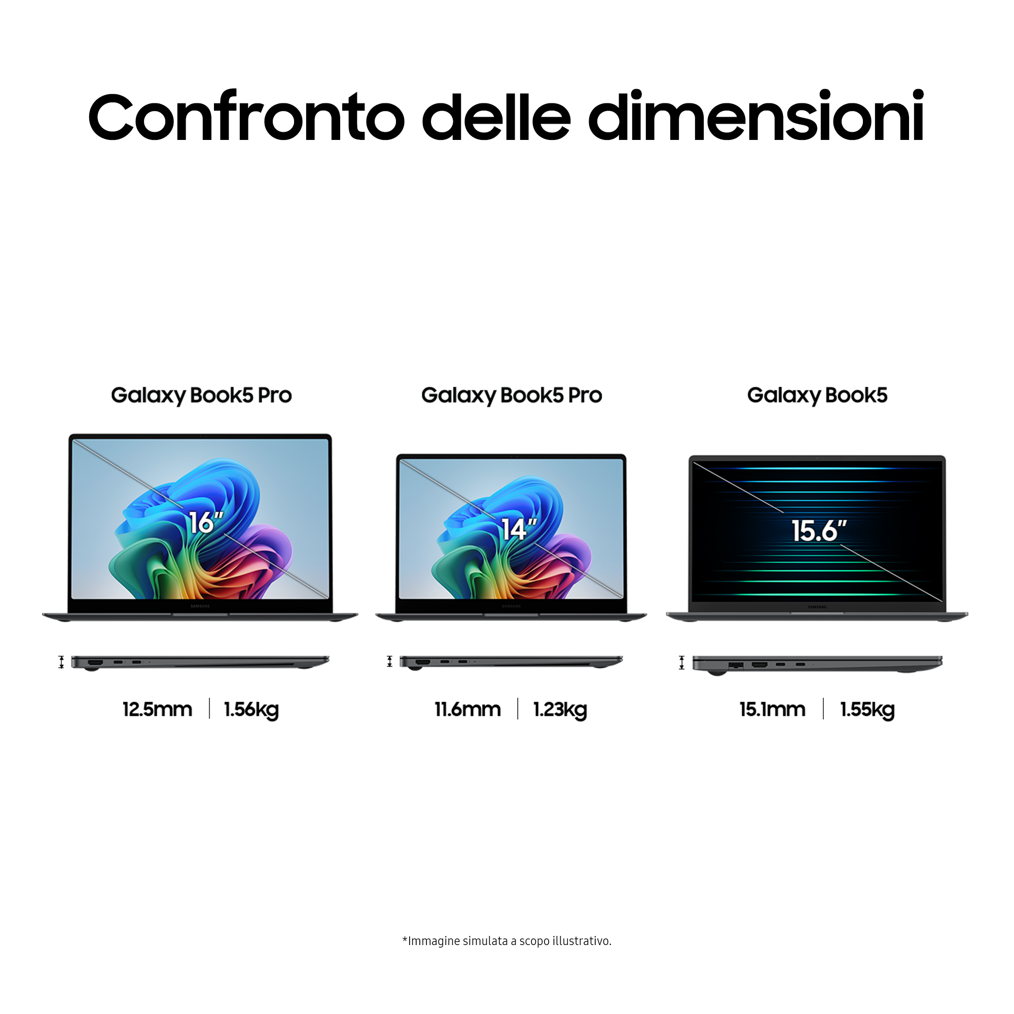 Grazie a un ampio schermo da 15.6”, Galaxy Book5 offre tutto lo spazio necessario per dedicare la massima attenzione ai tuoi programmi e alle tue attività preferite. Questo laptop sarà sempre al tuo fianco in ogni momento della giornata, dalle lezioni del mattino alle serate con gli amici, ed è così sottile e compatto che potrai portarlo con te ovunque: sul letto, sulla scrivania oppure sul divano.
