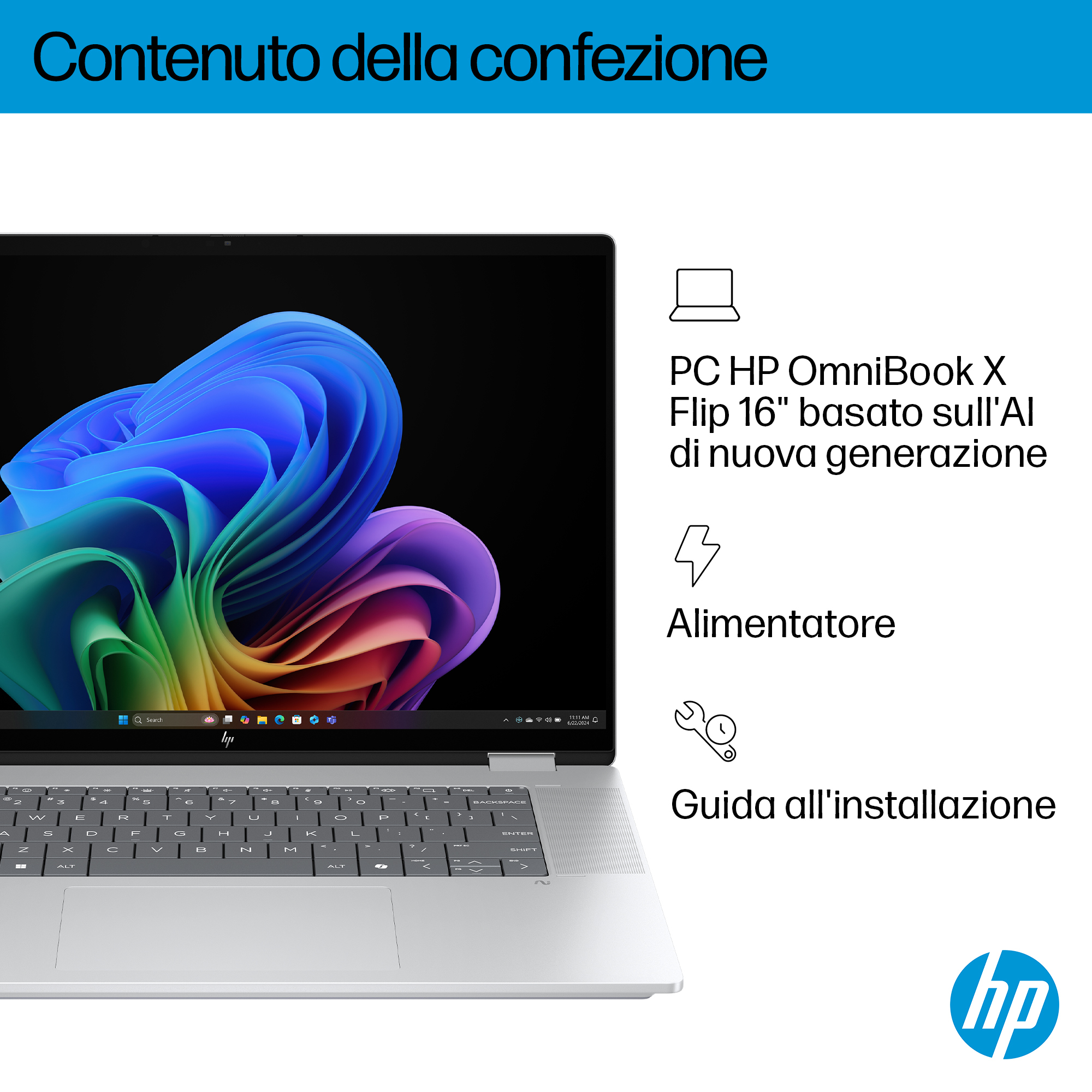 Il PC HP OmniBook X Flip 16 AI di nuova generazione combina velocità e prestazioni per attività creative e intrattenimento. L'ampio display da 16" si adatta alle tue esigenze di visualizzazione (piatto, piegato o capovolto) e offre colori brillanti da qualsiasi angolazione. Progettato con un elegante chassis in metallo riciclato[1] e una tastiera retroilluminata con ampi tasti per un'esperienza d'uso ottimale.
