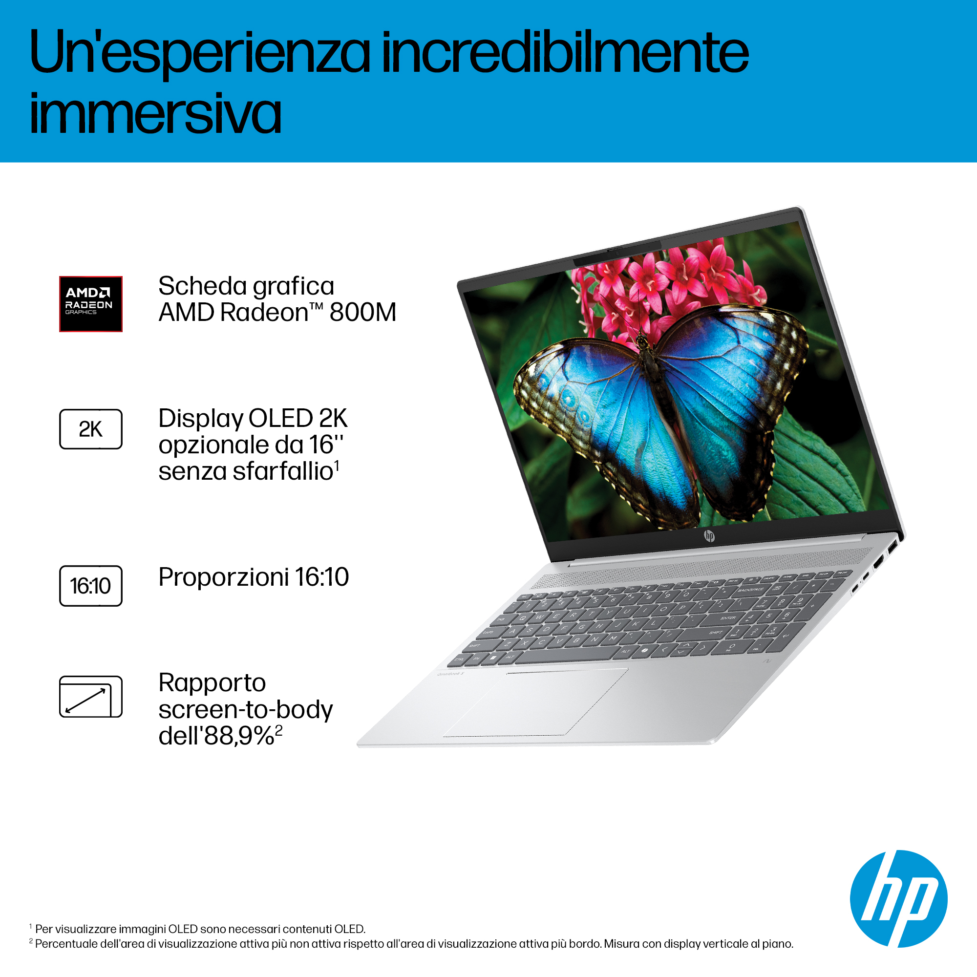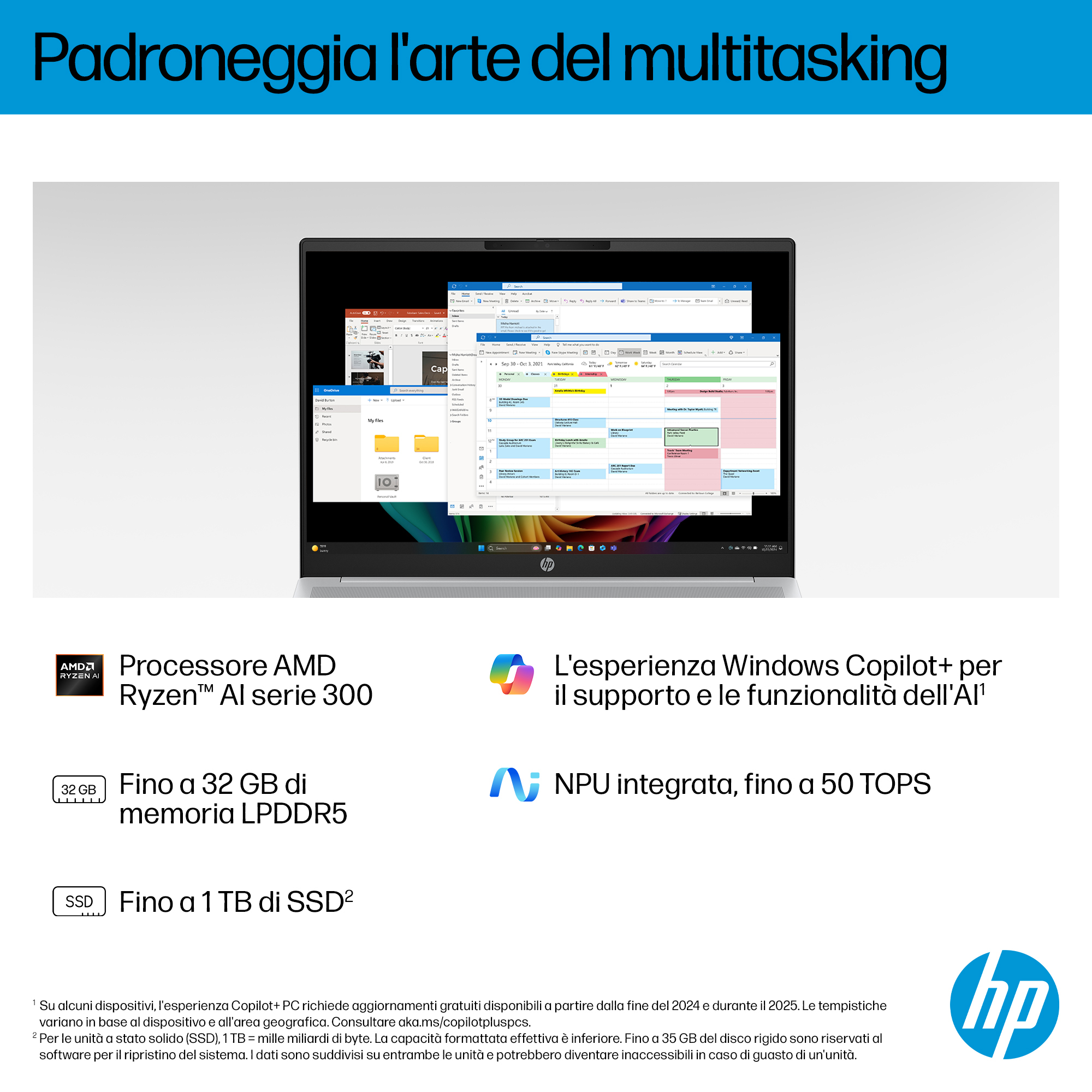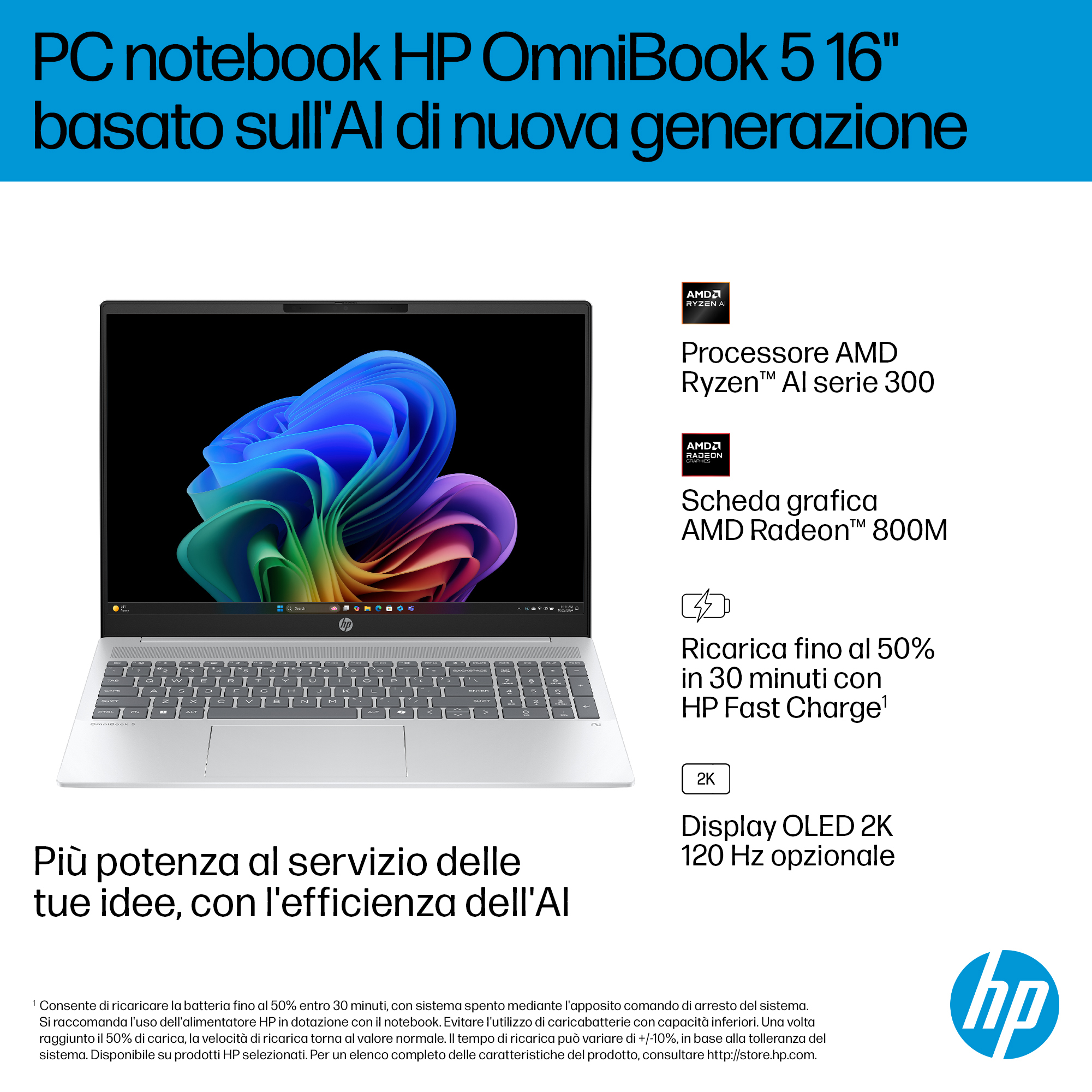 Semplifica la tua giornata con HP OmniBook 5, il PC laptop basato sull'AI, dotato di un processore AMD Ryzen™ AI serie 300[1] e fino a 50 TOPS per un multitasking continuo. Libera la creatività e porta il tuo gameplay a un livello superiore su un eccezionale display 2K[3], ricarica più rapidamente con HP Fast Charge[4], connettiti facilmente tramite USB-C e accedi istantaneamente all'AI con il tasto Copilot[5].