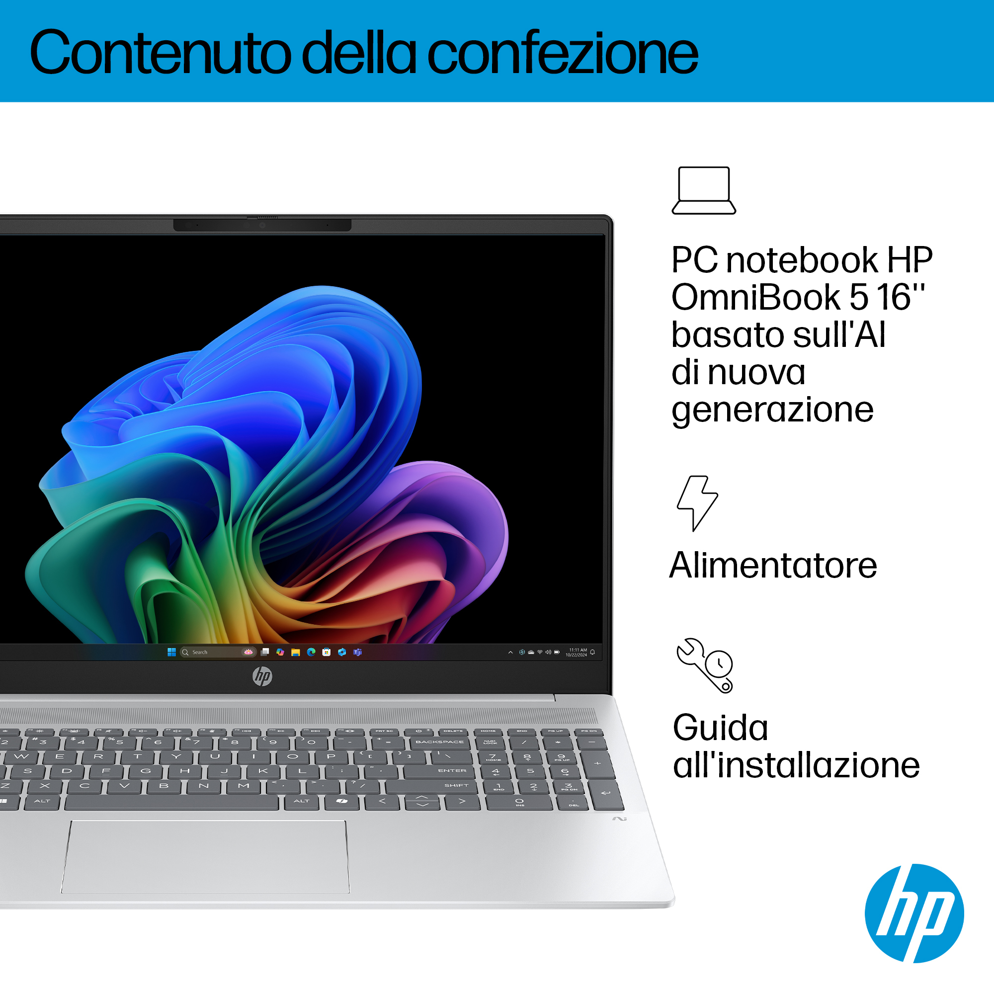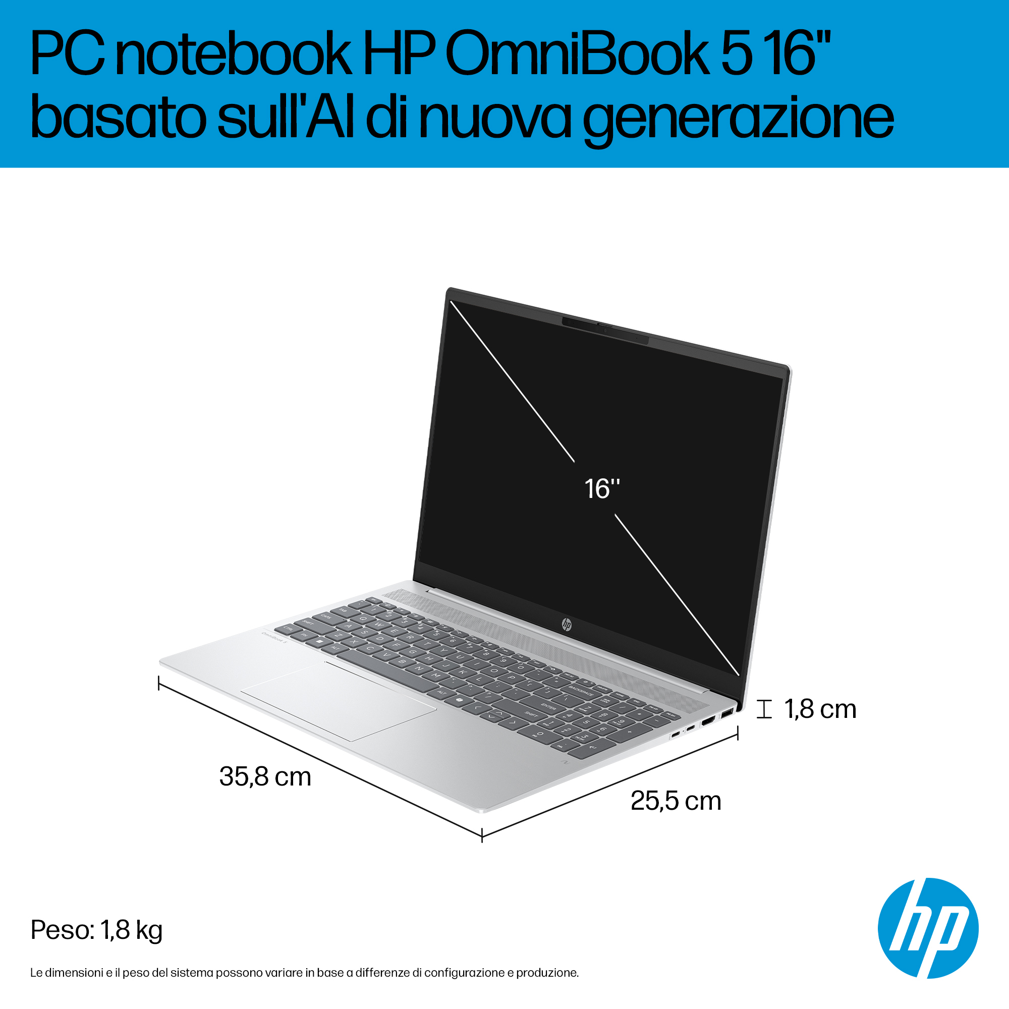 HP OmniBook 5 NGAI 16-ag1019nl. Fattore di forma: Clamshell. Famiglia processore: AMD Ryzen AI 7. Dimensioni diagonale schermo: 40,6 cm (16"), Tipologia HD: 2K, Risoluzione del display: 1920 x 1200 Pixel. RAM installata: 16 GB, Tipo di RAM: LPDDR5x-SDRAM. Modello scheda grafica integrata: AMD Radeon 860M. Sistema operativo incluso: Windows 11 Home. Peso: 1,79 kg