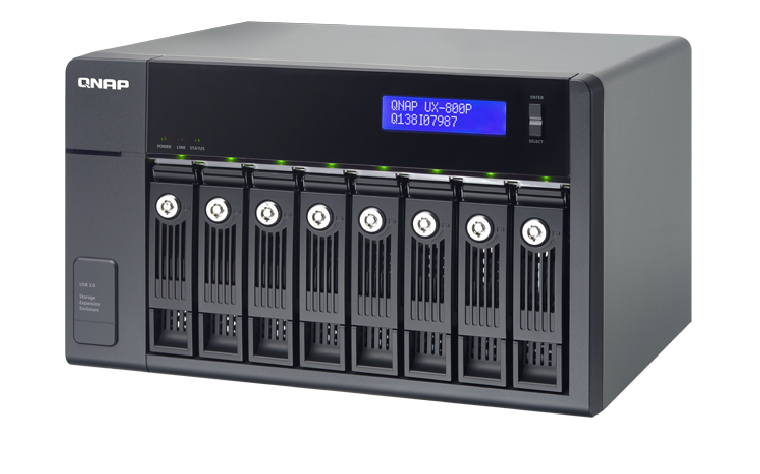 Quando si espande la capacità di archiviazione dei dati, l'implementazione di più server può portare a una complessità di gestione e anche ad un incremento notevole dei costi. L'enclosure di espansione di QNAP UX-800P è un alternativa di espansione economica progettata per un'installazione semplice in modo tale da espandere lo spazio di archiviazione totale di Turbo NAS. Collegando un enclosure di espansione, UX-800P offre un'espansione per lo spazio di archiviazione domestico e per i piccoli uffici senza problemi. UX-800P fornisce fino a 8 dischi rigidi aggiuntivi per Turbo NAS e consente di raggiungere una capacità raw totale di 48TB* rendendolo utile specialmente per il backup di dati, collezioni di media digitali e la videosorveglianza.