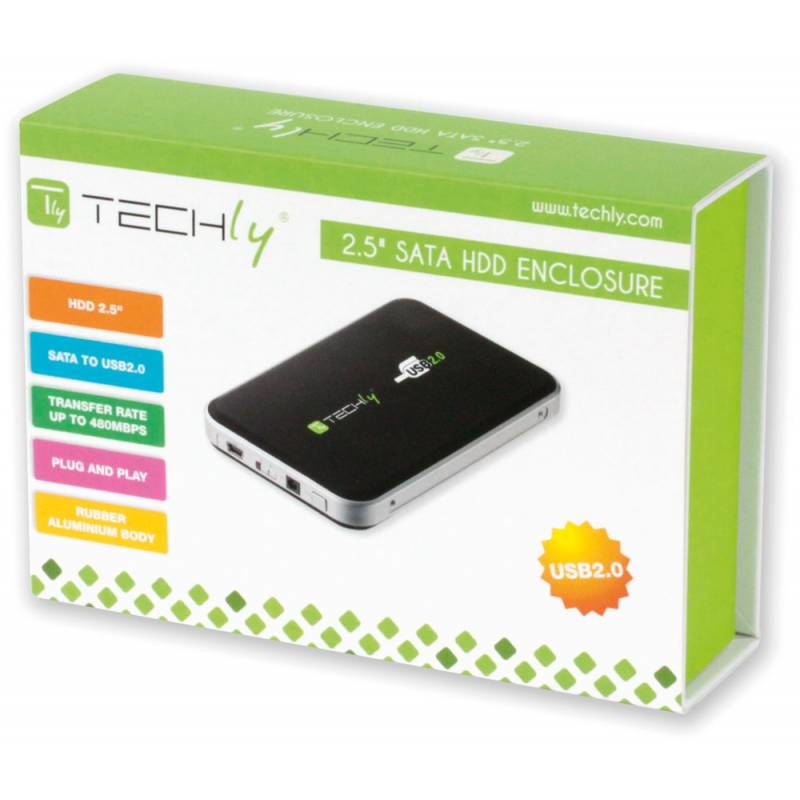 Techly Box HDD OTB Esterno SATA 2.5" USB 2.0 Nero (I-CASE SU-25TY). Dimensione del dispositivo di archiviazione: 2.5", Interfacce dell'unità di archiviazione supportate: SATA. Tipo di prodotto: Enclosure HDD, Colore del prodotto: Nero, Certificazione: • EC • RoHS • WEEE. Tipologia alimentazione: AC. Cavi inclusi: USB. Sistema operativo compatibile: Windows 98SE / Me / 2000/2003 / XP / Vista / 7/8, MAC OS 8.6 and higher, Velocità di trasferimento dati: 480 Mbit/s