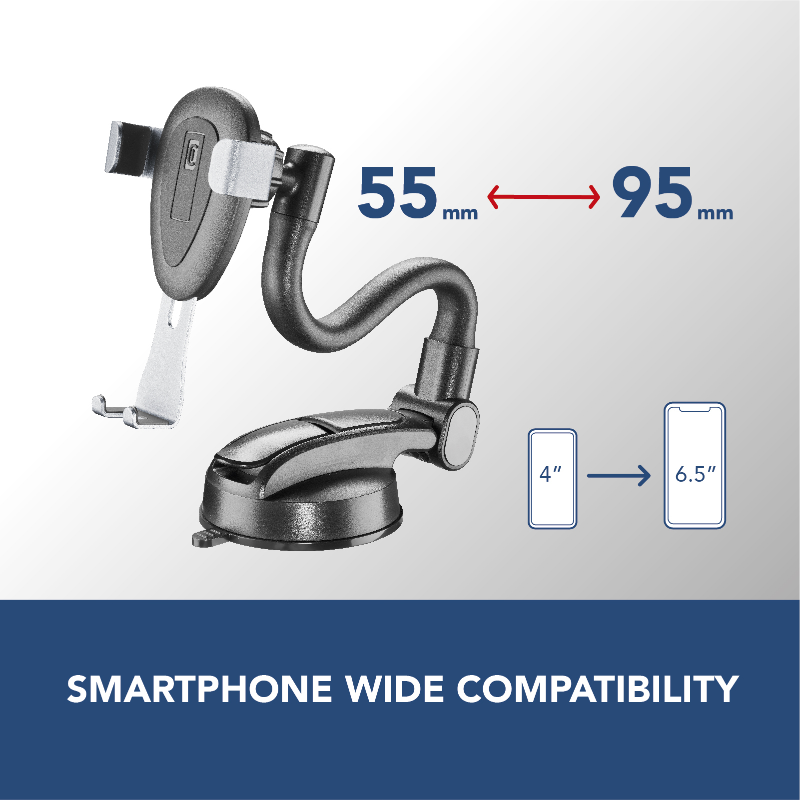 SLIDE FLEXY è il supporto a ventosa per auto che, grazie al peso del telefono, si adatta a tutti i tipi di smartphone, regolandosi automaticamente in base alle dimensioni, offrendo così una presa stabile. Il braccio flessibile riesce a ruotarsi a 360° consentendo la comodità di visione che si preferisce alla guida. La sua ventosa permette di fissarlo saldamente sia al cruscotto che al vetro.
