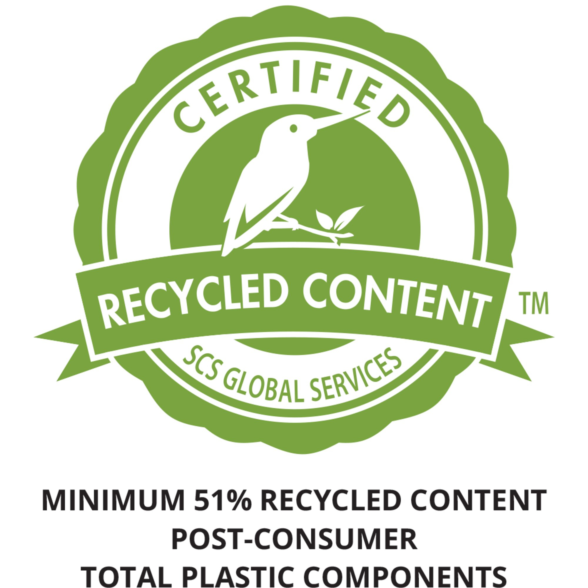Contenuto riciclato certificato che conforma allo standard SCS Recycled Content Standard V8-0 per un minimo del 51% di contenuto riciclato post-consumo dei componenti plastici totali. Esclusi scheda PCB, batteria ricaricabile e cavo di ricarica